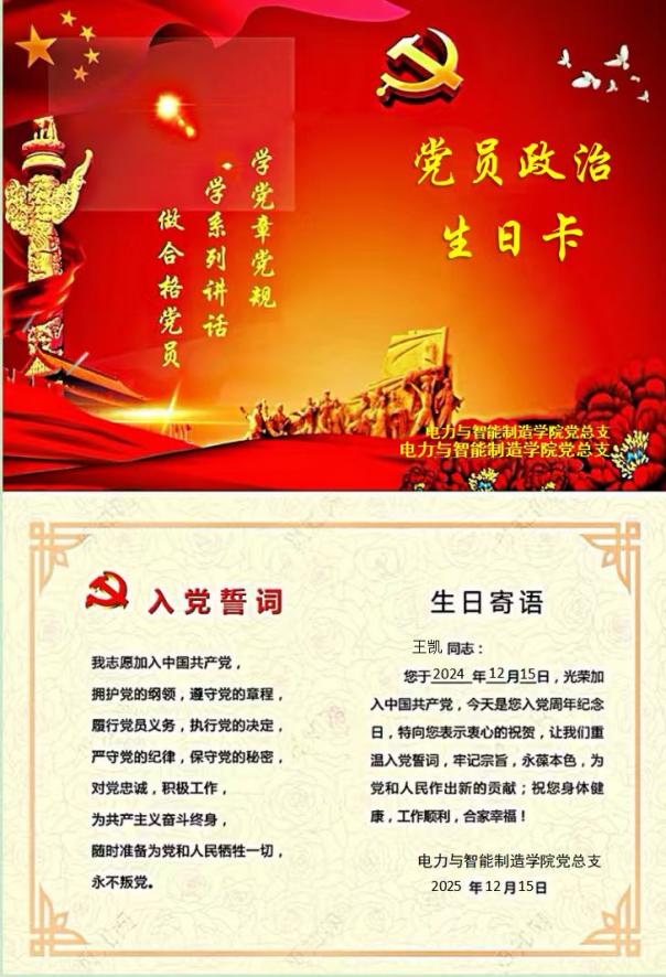 我是王凱,作為電力與智能制造學(xué)院的一名黨員輔導(dǎo)員,12月15日在收到學(xué)院黨組織發(fā)來的“政治生日”賀卡,我感到既開心又興奮,同時也感謝組織的關(guān)懷。
