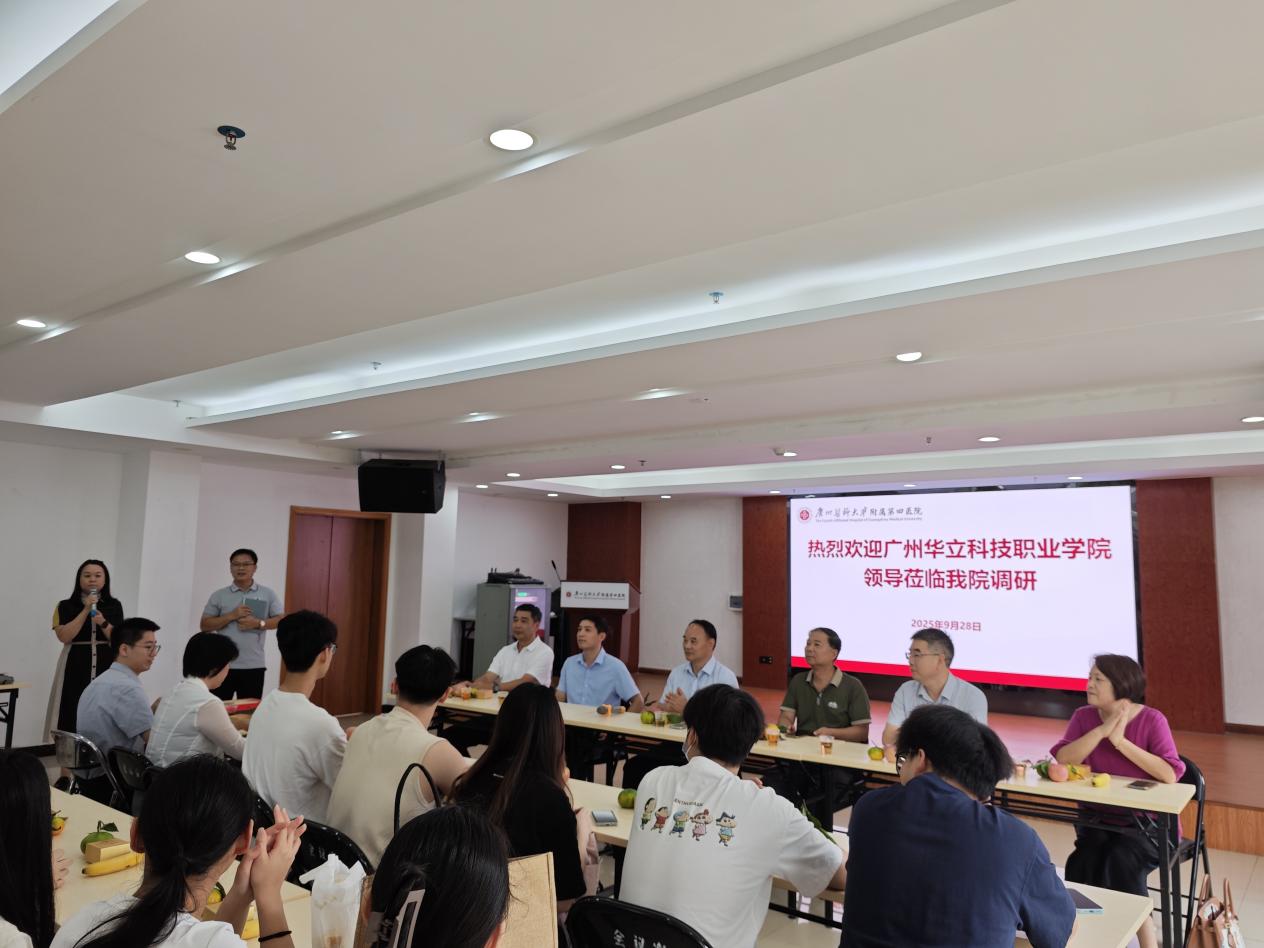 在國慶、中秋雙節(jié)來臨之際,2025年9月28日下午,我校廖俊杰校長、教務(wù)處孫麗英處長、實踐教學(xué)科韋建林科長、健康學(xué)院雷毅雄院長、李國良副院長、行政主任梁瑞云、實習(xí)指導(dǎo)老師鄧香華、楊鵬一行赴廣州醫(yī)科大學(xué)附屬第四醫(yī)院訪企拓崗,給健康學(xué)院2023級在該醫(yī)院進(jìn)行臨床實習(xí)的華立學(xué)子們送去節(jié)日的關(guān)懷。廣州醫(yī)科大學(xué)附屬第四醫(yī)院郭建軍副院長,科教科劉志毅副科長、陳彩青科護(hù)長,張琴口腔科主任等院領(lǐng)導(dǎo)熱情參與了中秋慰問活動。
