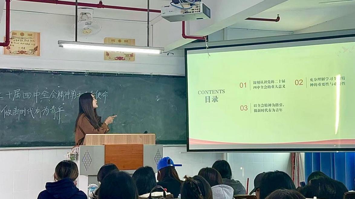 陳老師生動(dòng)闡釋道:“黨的二十屆四中全會(huì)為國(guó)家發(fā)展擘畫(huà)了宏偉藍(lán)圖,更與我們每位青年學(xué)子的成長(zhǎng)成才緊密相連?!彼貜?qiáng)調(diào),2025年是“十四五“ 收官與“十五五”謀劃的關(guān)鍵之年,深入學(xué)習(xí)全會(huì)精神,是青年學(xué)子認(rèn)清時(shí)代方位、找準(zhǔn)人生航向的 “必修課”,能幫助大家在專(zhuān)業(yè)學(xué)習(xí)與人生規(guī)劃中明確方向、積蓄?yuàn)^進(jìn)力量。