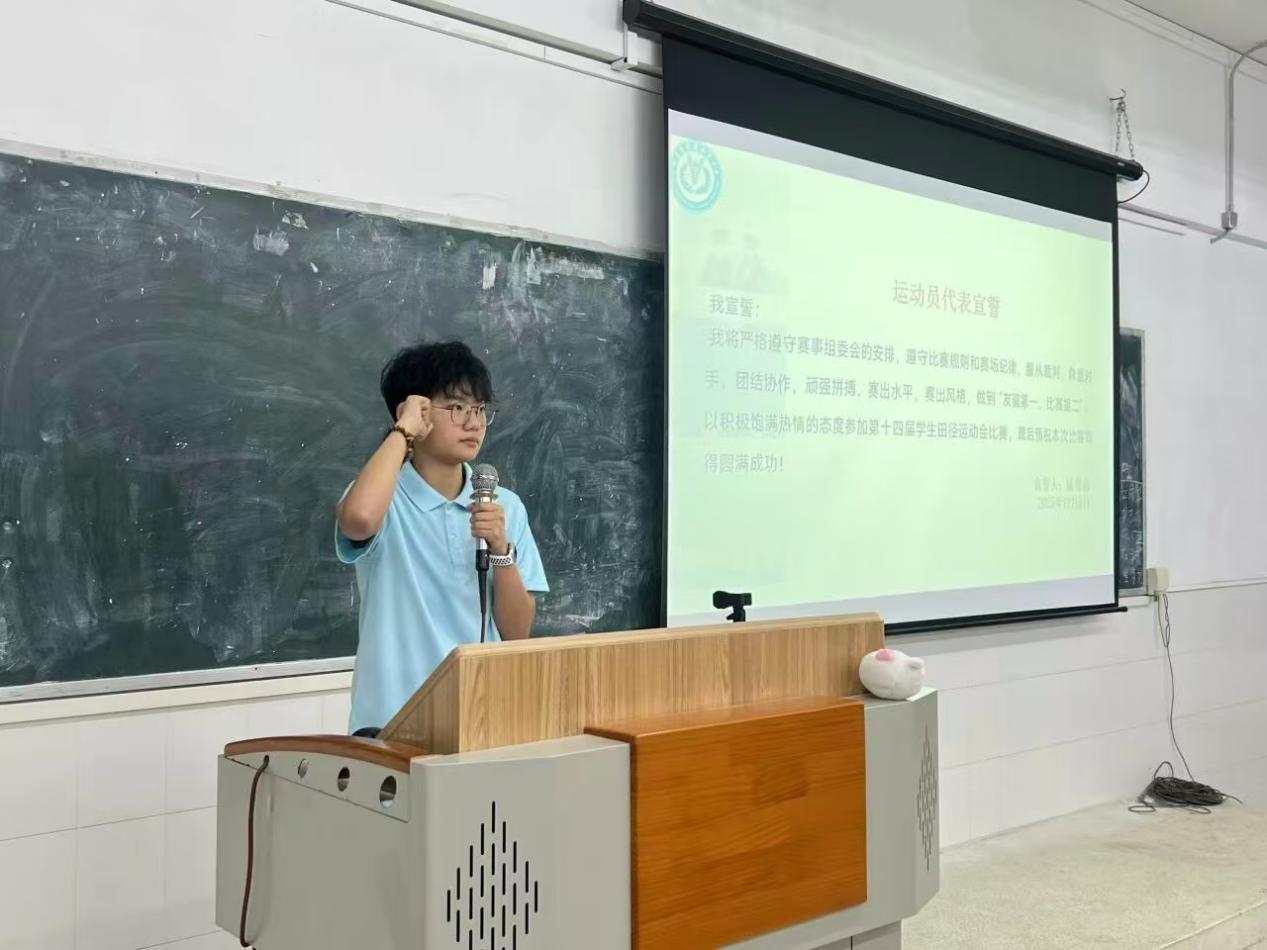 運動員代表陳彗嘉同學(xué)發(fā)言并宣誓,她表示“青春逐夢,賽場礪志”,全體運動員將以昂揚姿態(tài)全力以赴,堅定信念、奮勇拼搏,嚴(yán)守規(guī)則、文明參賽,用汗水書寫熱血與擔(dān)當(dāng),不負(fù)韶華、不負(fù)熱愛,全力沖刺創(chuàng)造佳績。志愿者代表張梓瑩同學(xué)也作出鄭重表態(tài),她以“以志愿之名,赴青春之約”為初心,承諾志愿者團隊將堅守崗位、恪盡職守,熱情服務(wù)、全力護航,用責(zé)任與擔(dān)當(dāng)保障賽事順利進行,以赤誠初心傳遞溫暖力量。
