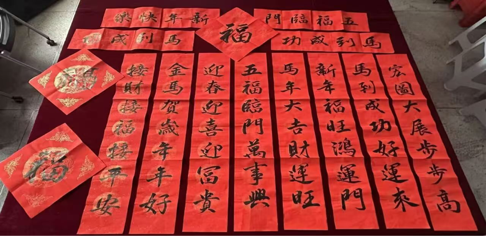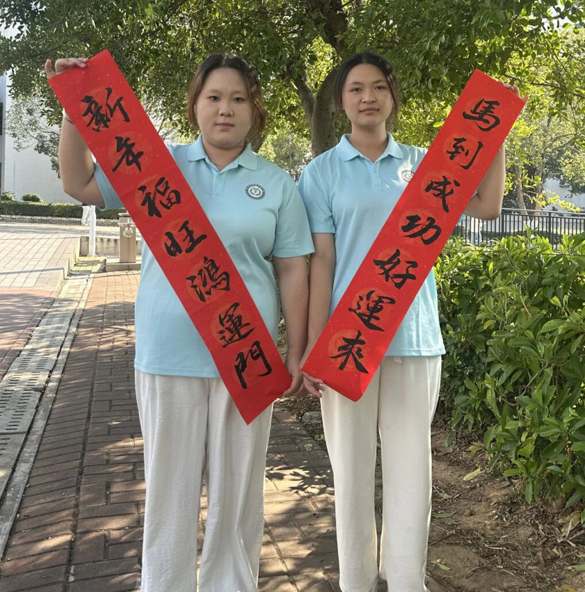 活動現(xiàn)場暖意融融,處處洋溢著節(jié)日的喜悅。同學(xué)們分工協(xié)作、默契配合,有的穿梭于校園各處懸掛彩飾紅綢,讓鮮艷的色彩點亮冬日校園;有的精心張貼福字貼紙,將美好祝愿融入校園的每個角落;還有的揮毫落筆,將“新年福旺鴻運門,馬到成功好運來”等寓意吉祥的對聯(lián)張貼于門楣兩側(cè)。清脆的笑語、膠帶撕拉的輕響與墨香交織,暖燈與紅綢相映,為校園