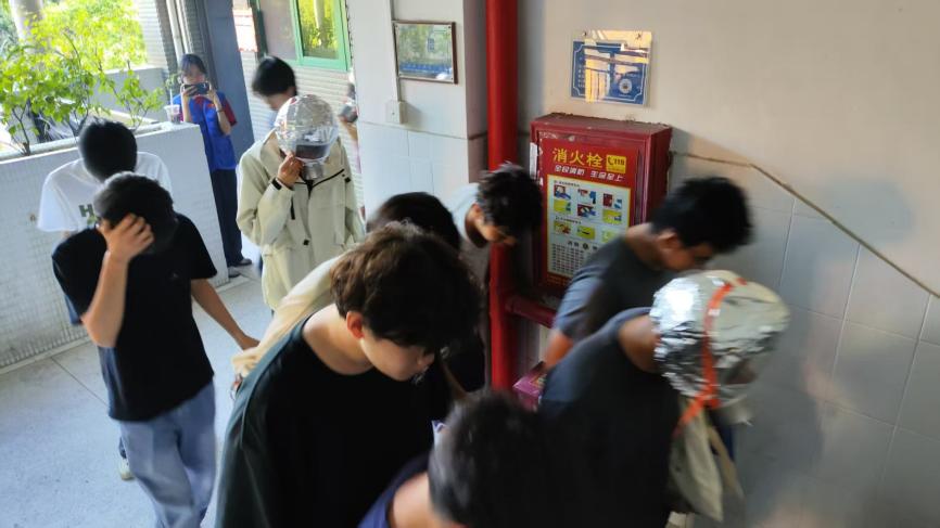 在防毒面罩實(shí)操結(jié)束后,進(jìn)行了人員疏散學(xué)習(xí)、緊急疏散學(xué)習(xí),以及疏散步驟學(xué)習(xí),并明確疏散技巧。隨時(shí)模擬濃煙升起,師生利用快速利用身旁工具減少毒煙吸入,不使用電梯,俯身沿墻體快速疏散到安全開闊的地方。