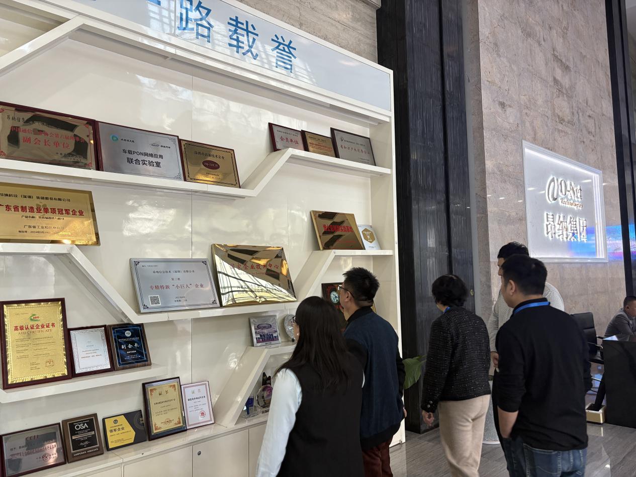 交流首站,學(xué)院領(lǐng)導(dǎo)參觀了企業(yè)榮譽展示區(qū):陳列的“廣東省制造業(yè)單項冠軍企業(yè)”等資質(zhì)牌匾、合作榮譽,直觀展現(xiàn)了昂納在信息技術(shù)領(lǐng)域的行業(yè)影響力,也為雙方后續(xù)溝通鋪墊了產(chǎn)業(yè)實力認知基礎(chǔ)。