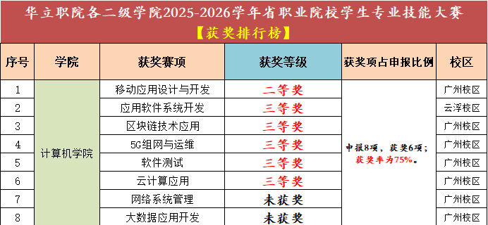 根據(jù)本次省職業(yè)院校學(xué)生專業(yè)技能大賽獲獎(jiǎng)數(shù)據(jù)顯示,計(jì)算機(jī)信息工程學(xué)院共申報(bào) 8 個(gè)賽項(xiàng),斬獲 6 項(xiàng)獎(jiǎng)項(xiàng),獲獎(jiǎng)率達(dá) 75%。其中,“移動(dòng)應(yīng)用設(shè)計(jì)與開發(fā)” 賽項(xiàng)榮獲二等獎(jiǎng),“應(yīng)用軟件系統(tǒng)開發(fā)”“區(qū)塊鏈技術(shù)應(yīng)用”“5G 組網(wǎng)與運(yùn)維”“軟件測(cè)試”“云計(jì)算應(yīng)用” 5 個(gè)賽項(xiàng)分別斬獲三等獎(jiǎng),充分展現(xiàn)了學(xué)院在計(jì)算機(jī)應(yīng)用技術(shù)領(lǐng)域的扎實(shí)教學(xué)功底與學(xué)生過硬的專業(yè)技能。