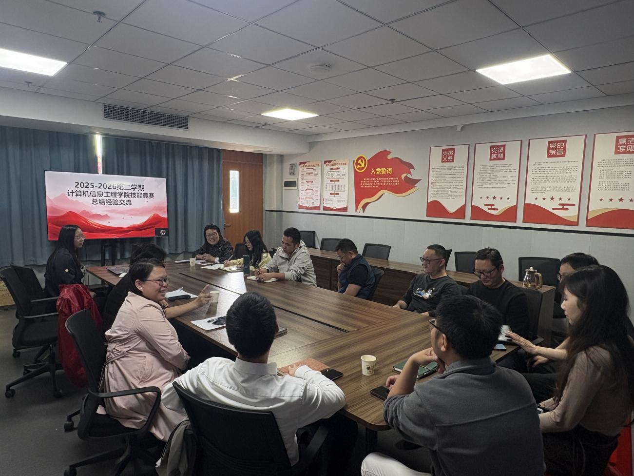 為總結(jié)競賽經(jīng)驗(yàn)、凝練育人成果,推動(dòng)專業(yè)技能人才培養(yǎng)質(zhì)量提升,2026年3月16日,計(jì)算機(jī)信息工程學(xué)院在會(huì)議室召開廣東省職業(yè)技能競賽總結(jié)經(jīng)驗(yàn)交流會(huì)。學(xué)院院長王建華、副院長閔小翠,教科研主任及競賽指導(dǎo)老師(云浮校區(qū)線上參加)齊聚一堂,圍繞省職業(yè)院校學(xué)生專業(yè)技能大賽參賽與獲獎(jiǎng)情況展開深入交流。