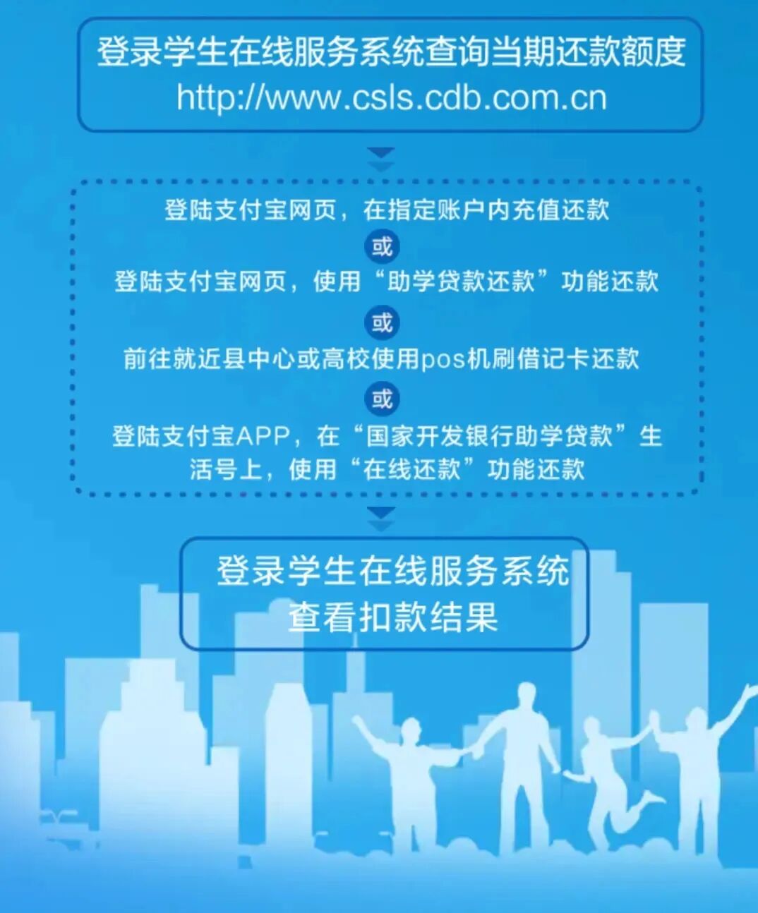 (1)正常還款:在11月1日至12月20日之間(最后一年為9月1日至9月20日之間),登錄學(xué)生在線服務(wù)系統(tǒng),查詢當(dāng)期還款額度,系統(tǒng)用戶名為借款學(xué)生身份證號,如密碼遺忘可撥打95593進(jìn)行重置。