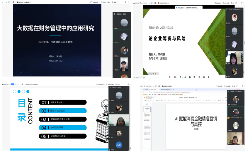 本次答辯經(jīng)過(guò)前期嚴(yán)格篩選,共有9位來(lái)自不同專業(yè)的優(yōu)秀畢業(yè)生代表參加。本次答辯采用線上線下結(jié)合方式。答辯過(guò)程中,同學(xué)們圍繞各自的論文選題,通過(guò)清晰的陳述、詳實(shí)的數(shù)據(jù)分析和完整的邏輯論證,展示了在校期間扎實(shí)的專業(yè)知識(shí)、熟練的技能應(yīng)用以及將理論聯(lián)系實(shí)際解決問(wèn)題的能力。論文選題緊密契合“大數(shù)據(jù)+”時(shí)代背景,覆蓋智能財(cái)務(wù)分析、金融風(fēng)險(xiǎn)數(shù)據(jù)建模、數(shù)字化金融服務(wù)創(chuàng)新等多個(gè)前沿領(lǐng)域,體現(xiàn)了專業(yè)群緊跟行業(yè)發(fā)展趨勢(shì)、注重跨學(xué)科融合培養(yǎng)的特色。