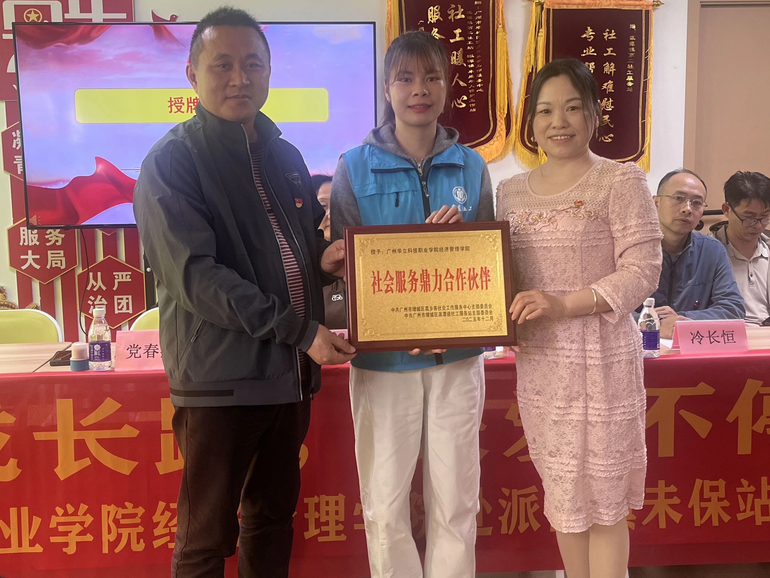 隨后,愛心傳遞步入正式環(huán)節(jié)。經(jīng)濟(jì)管理學(xué)院黨總支書記、院長劉惠玲作為捐贈(zèng)方代表,與受贈(zèng)方代表、派潭鎮(zhèn)第二社工服務(wù)站主任黨春燕鄭重簽署捐贈(zèng)協(xié)議,將幫扶的承諾落到實(shí)處。生活學(xué)院院長李春洪、經(jīng)濟(jì)管理學(xué)院副院長朱向平從黨春燕主任手中接過“社會(huì)組織鼎力合作伙伴”榮譽(yù)授牌。這枚授牌不僅是對(duì)學(xué)校公益行動(dòng)的認(rèn)可,更象征著校社攜手關(guān)愛困境兒童的責(zé)任傳遞,彰顯了高校服務(wù)社會(huì)的使命擔(dān)當(dāng)。