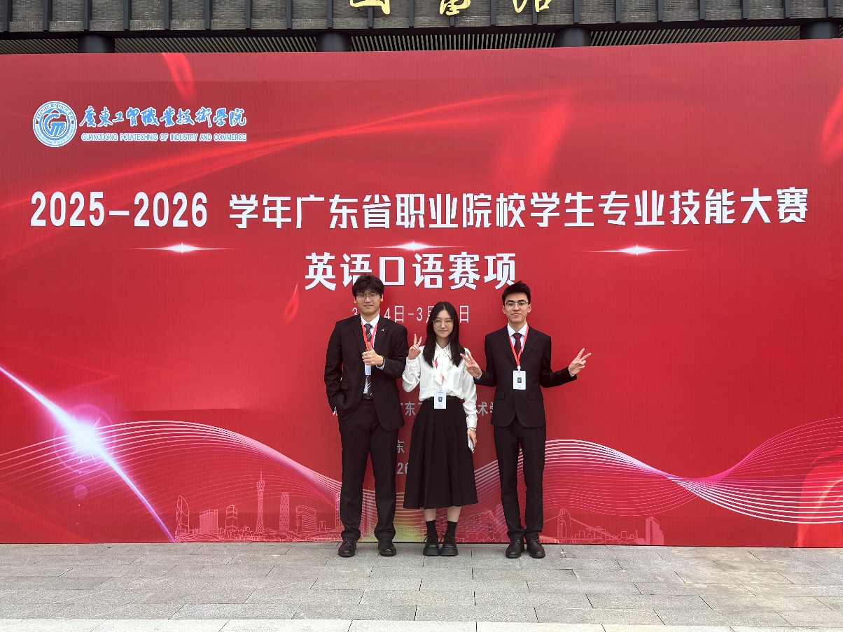 3月15日至16日,由廣東省教育廳主辦的2025-2026年度廣東省職業(yè)院校技能大賽(高職組)英語口語賽項(xiàng)圓滿落幕。本次大賽匯聚全省87所高職院校320余名選手同臺競技,賽制設(shè)置 “職場描述”“情景交流”及“綜合展示”等模塊,全面考查選手英語應(yīng)用能力與團(tuán)隊(duì)協(xié)作素養(yǎng)。經(jīng)過兩天激烈角逐,我校云浮校區(qū)經(jīng)管學(xué)院劉有為、袁靖宜、吳宇峰(圖1)三名同學(xué)憑借扎實(shí)的語言功底和穩(wěn)定的臨場發(fā)揮,榮獲團(tuán)體三等獎。