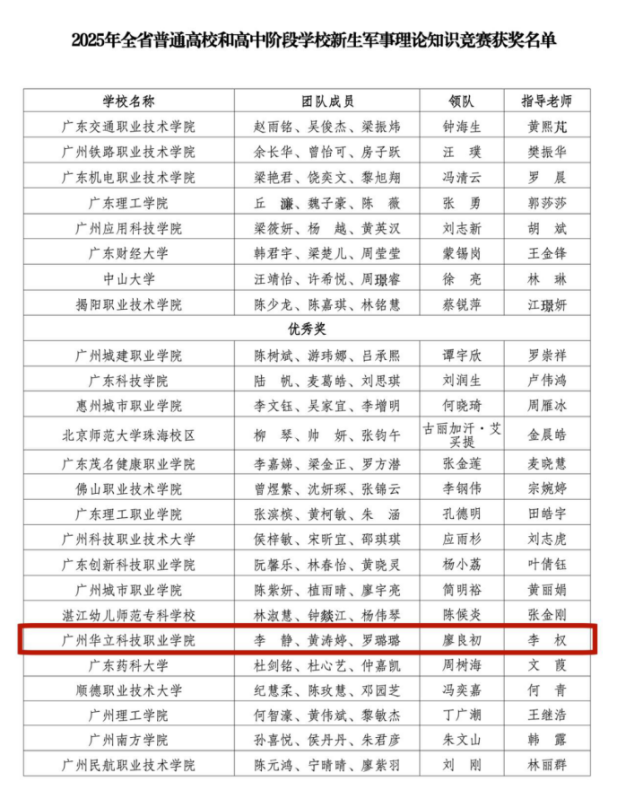 12月26日,由廖良初院長帶隊(duì),李權(quán)老師擔(dān)任指導(dǎo)老師,經(jīng)濟(jì)管理學(xué)院黃濤婷,羅璐璐和中醫(yī)藥學(xué)院李靜三位同學(xué)參加“廣東省普通高校2025級(jí)新生軍事理論知識(shí)競(jìng)賽”圓滿落幕。我校代表隊(duì)在全省150所本、??聘咝4黻?duì)同臺(tái)競(jìng)技的激烈角逐中,憑借扎實(shí)的理論功底、默契的團(tuán)隊(duì)協(xié)作在眾多參賽高校中脫穎而出,取得第42名的優(yōu)異成績,斬獲優(yōu)秀獎(jiǎng),充分展現(xiàn)了我校2025級(jí)新生良好的軍事素養(yǎng)和精神風(fēng)貌。