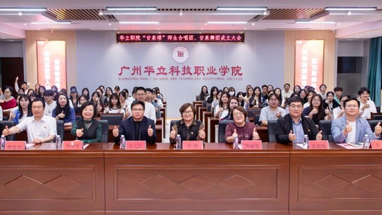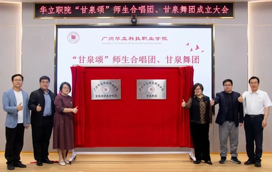 在全場見證下,廣州市甘泉文化研究會執(zhí)行會長、廣州華立科技職業(yè)學院常務副校長馬俊教授、廣州市甘泉文化研究會副會長、馬克思主義學院院長廖良初教授、廣州華立科技職業(yè)學院人事處處長鐘文浩、教務處處長孫麗英、校團委書記張超越、藝術(shù)與傳媒學院院長朱君共同為“甘泉頌”師生合唱團、甘泉舞團成立揭牌。