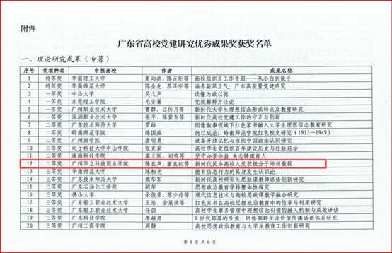 近日,廣東省高等學(xué)校黨的建設(shè)研究會(huì)公布了高校黨建研究?jī)?yōu)秀成果獎(jiǎng)獲獎(jiǎng)名單,全省共有103項(xiàng)成果獲獎(jiǎng),其中民辦高職院校只有3個(gè)項(xiàng)目上榜。我校黨委書記陳良聲、馬克思主義學(xué)院院長(zhǎng)廖良初組織思政課教師主編的《新時(shí)代民辦高校入黨積極分子培訓(xùn)教程》榮獲理論研究成果(專著類)二等獎(jiǎng),該獎(jiǎng)項(xiàng)全省共評(píng)出20項(xiàng),我校是該獎(jiǎng)項(xiàng)唯一獲獎(jiǎng)的高職院校。