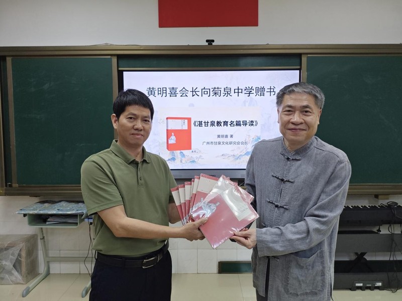 座談會(huì)上黃明喜會(huì)長(zhǎng)向菊泉中學(xué)贈(zèng)送了他最近出版的新書《湛甘泉教育名篇導(dǎo)讀》。