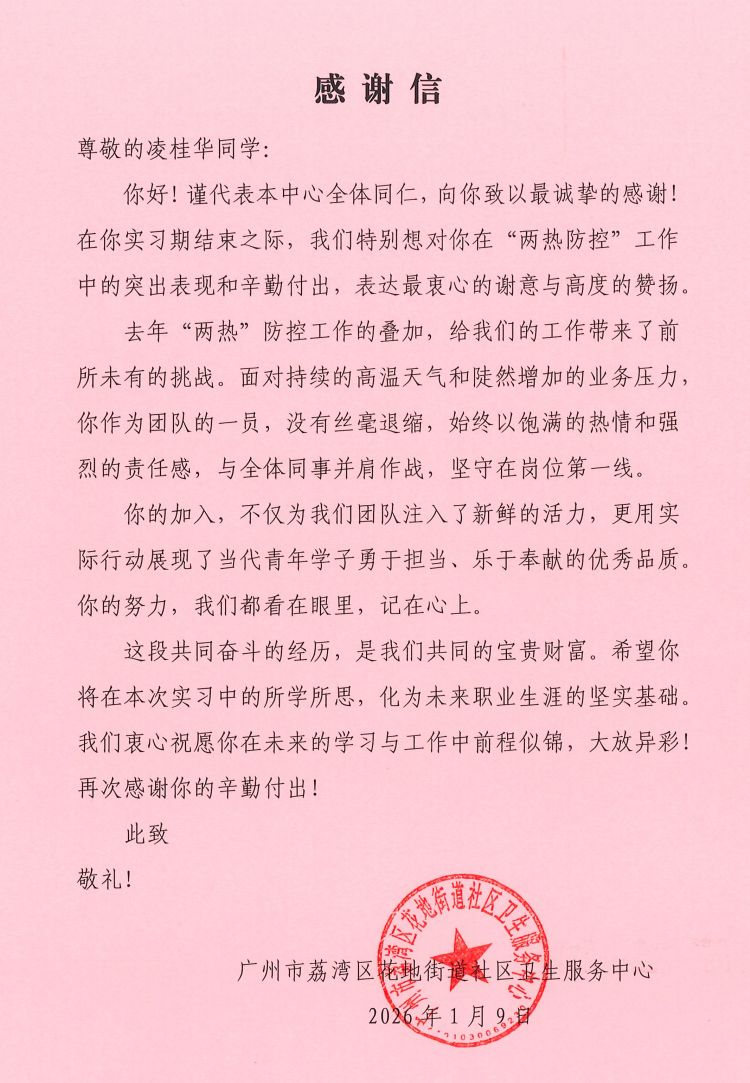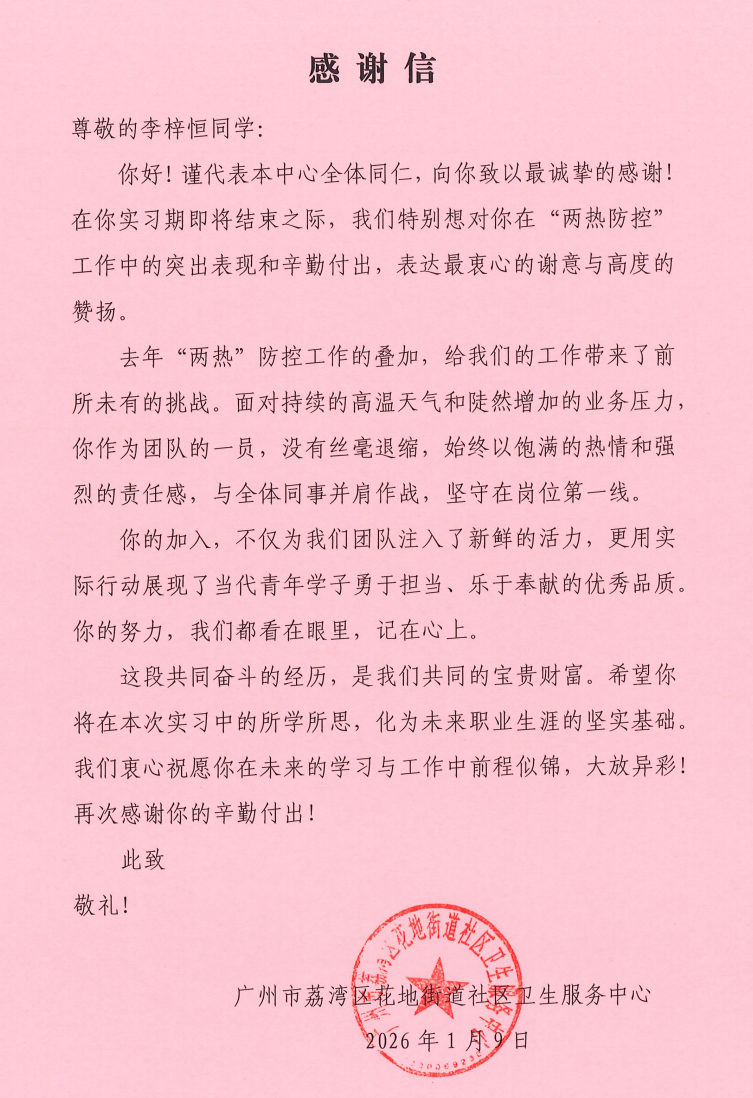 近日,廣州市荔灣區(qū)花地街道社區(qū)衛(wèi)生服務(wù)中心正式向我院發(fā)來三封感謝信,對 2023 級實習生李淑冰(23 中醫(yī) 17 班)、凌桂華(23 中醫(yī) 17 班)、李梓恒(23 藥學 6 班)在基層實習期間的優(yōu)異表現(xiàn)給予高度評價與特別表揚,充分肯定了三位學子的職業(yè)素養(yǎng)與實踐能力。
