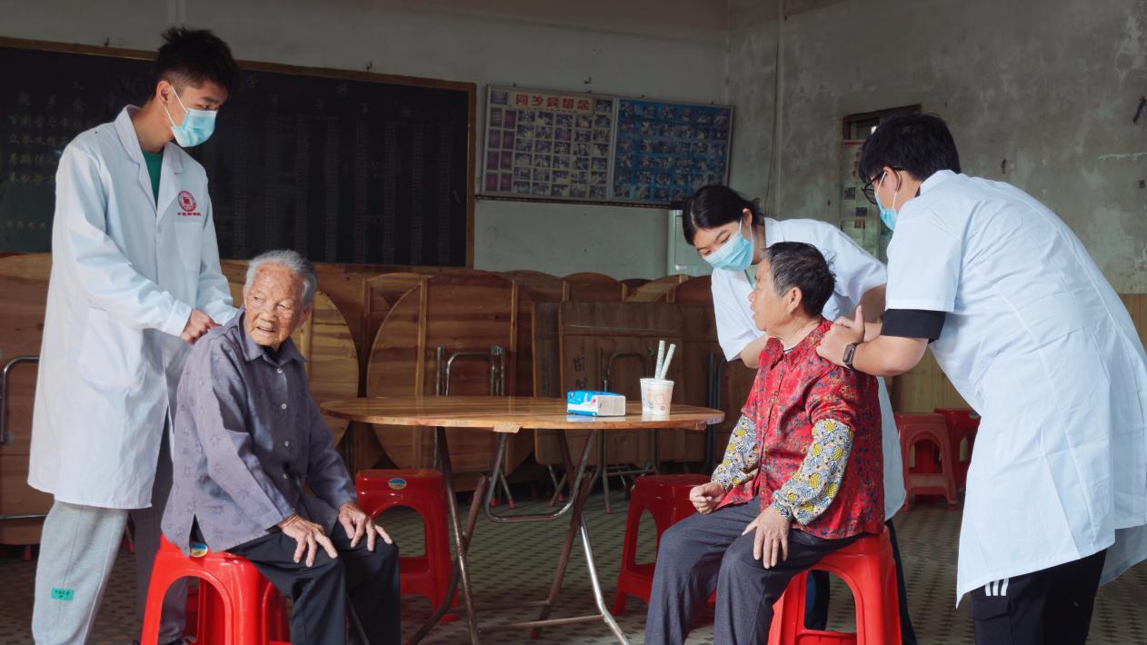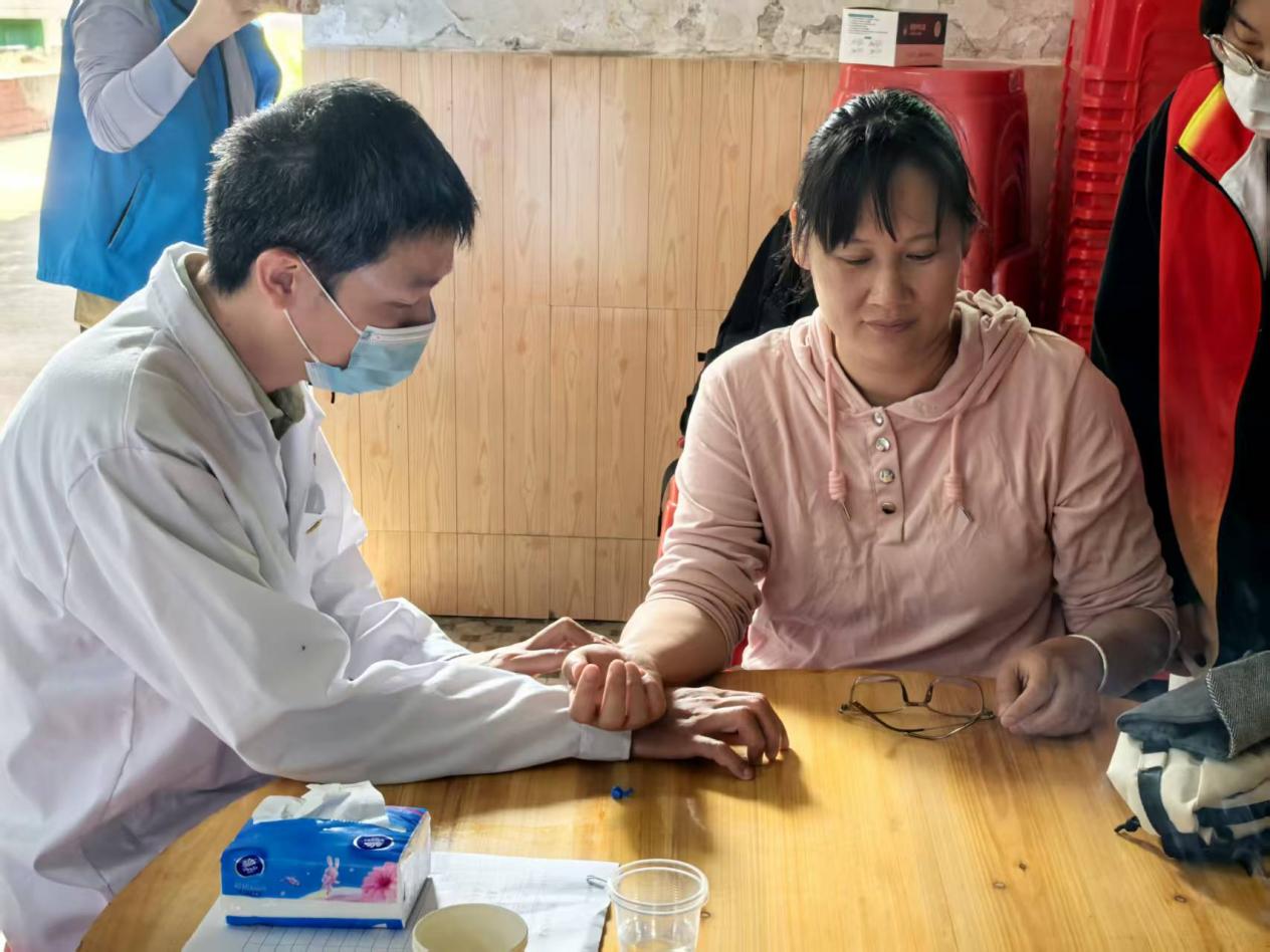 活動由潘菽弢、李楚勇、黃榮派三位老師帶隊,學(xué)院黨建小組、中醫(yī)藥應(yīng)用研究所、就業(yè)促進會選派11名同學(xué)組成志愿服務(wù)隊,與社工站工作人員協(xié)同配合,有序開展各項服務(wù)。在田心村村委會集中義診點,志愿者們細致為村民測量血壓,提供艾灸、推拿等中醫(yī)適宜技術(shù)服務(wù),耐心解答健康咨詢。潘菽弢博士現(xiàn)場為村民脈診,結(jié)合體質(zhì)特點給出個性化養(yǎng)生建議與調(diào)理方案,用專業(yè)知識守護村民健康。