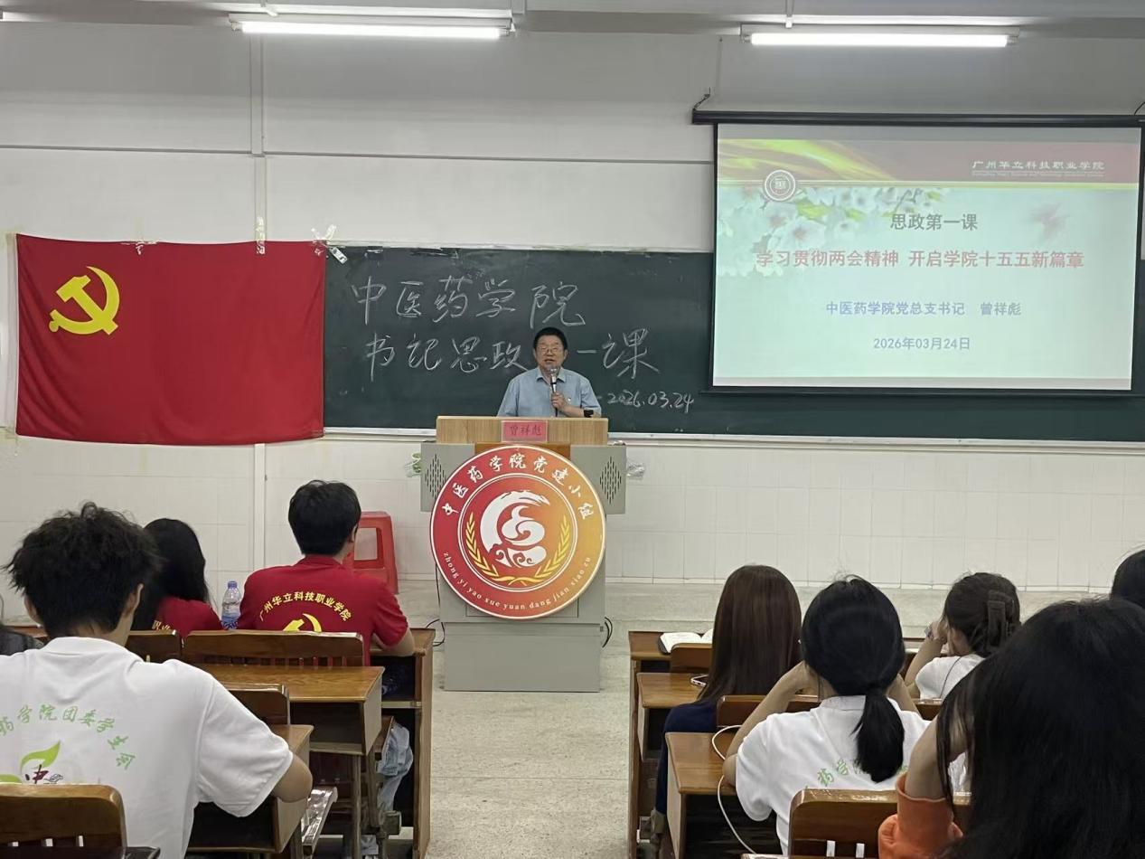 2026年3月24日,廣州華立科技職業(yè)學(xué)院中醫(yī)藥學(xué)院于圖書(shū)館401教室開(kāi)展思政第一課專題學(xué)習(xí)活動(dòng)。本次課程由中醫(yī)藥學(xué)院黨總支書(shū)記曾祥彪主講,學(xué)院師生代表齊聚一堂,深入學(xué)習(xí)貫徹全國(guó)兩會(huì)精神,緊扣國(guó)家發(fā)展戰(zhàn)略,共同探討學(xué)院開(kāi)啟“十五五”發(fā)展新篇章的實(shí)踐路徑,凝聚師生奮進(jìn)力量。