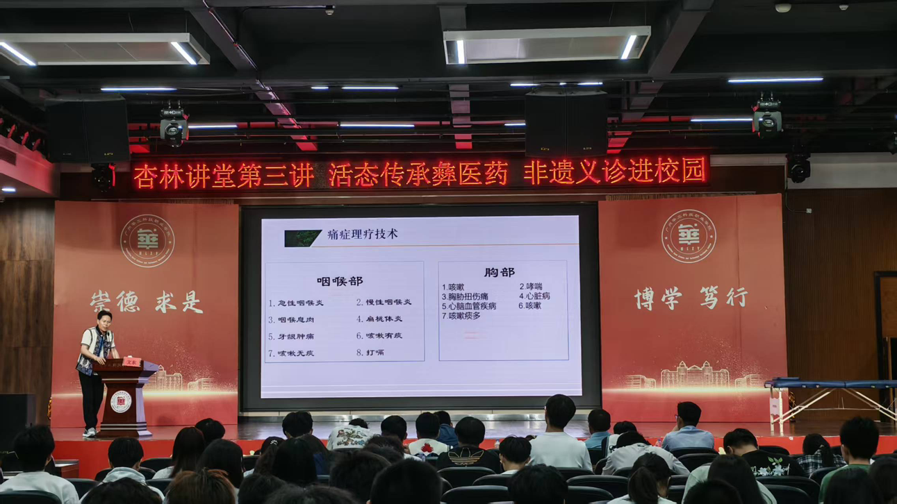 為傳承弘揚(yáng)中華優(yōu)秀傳統(tǒng)醫(yī)藥文化,推動(dòng)國(guó)家級(jí)非物質(zhì)文化遺產(chǎn)彝醫(yī)藥活態(tài)傳承,搭建傳統(tǒng)民族醫(yī)藥與校園健康教育的橋梁,近日,廣州華立科技職業(yè)學(xué)院中醫(yī)藥學(xué)院精心舉辦彝醫(yī)藥專題講座暨彝醫(yī)飛針公益義診活動(dòng)。國(guó)家級(jí)非遺彝醫(yī)適應(yīng)性技術(shù)醫(yī)師親臨校園,以理論授課+實(shí)操義診的形式,讓全校師生近距離感受彝醫(yī)藥的獨(dú)特魅力與神奇療效。這項(xiàng)古老而神奇的診療技藝帶進(jìn)校園,讓師生們零距離感受民族醫(yī)學(xué)的獨(dú)特魅力。