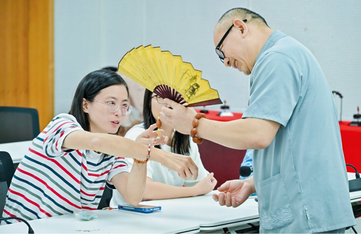 在大師的指導(dǎo)下,學(xué)員們紛紛參與互動,拿起砂紙在欖雕雛形上進(jìn)行打磨,一個個作品慢慢變得精細(xì)光潔。他們專注在自己的創(chuàng)作中,每個人的臉上都洋溢著對技藝的敬畏和對藝術(shù)的熱愛。