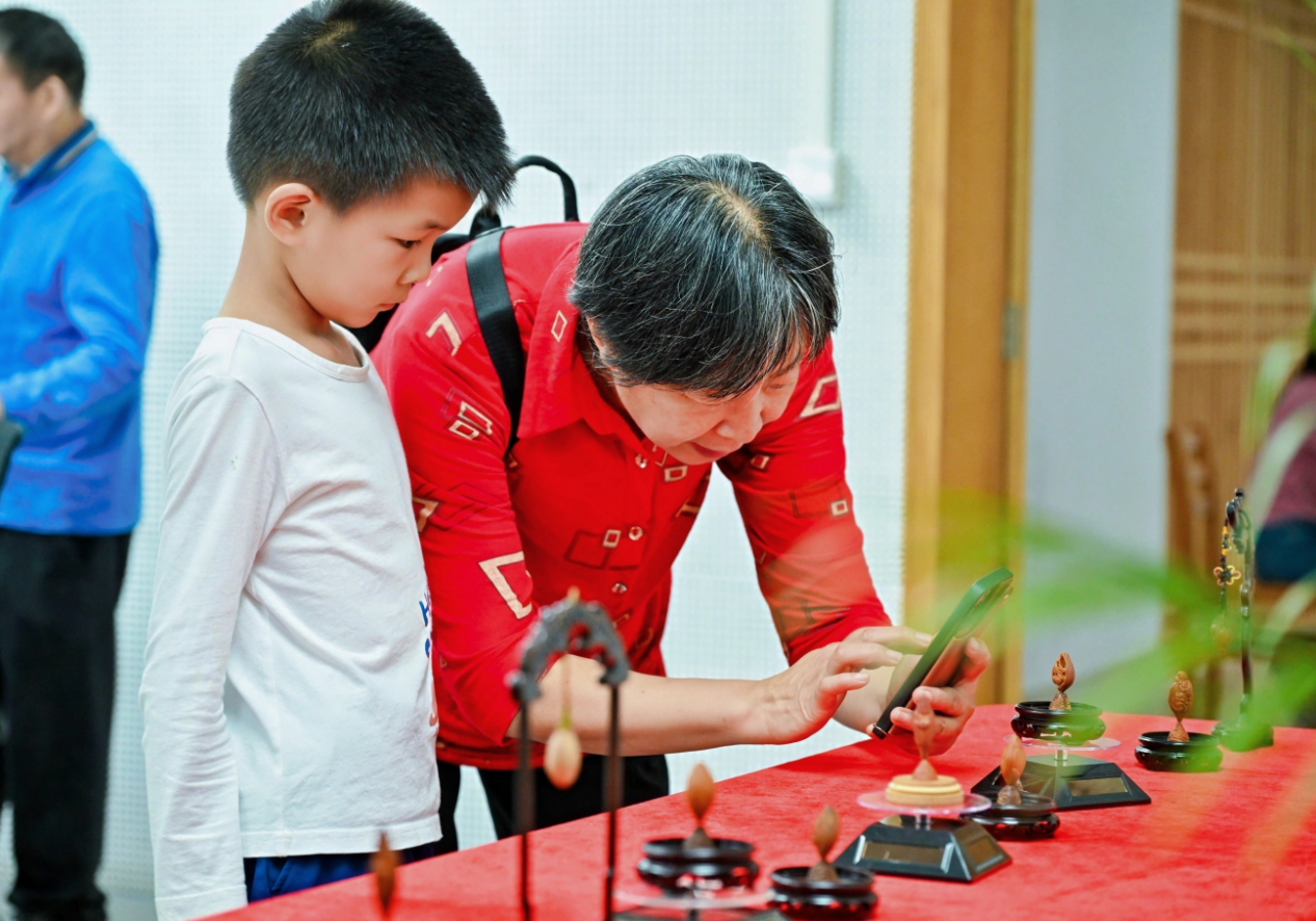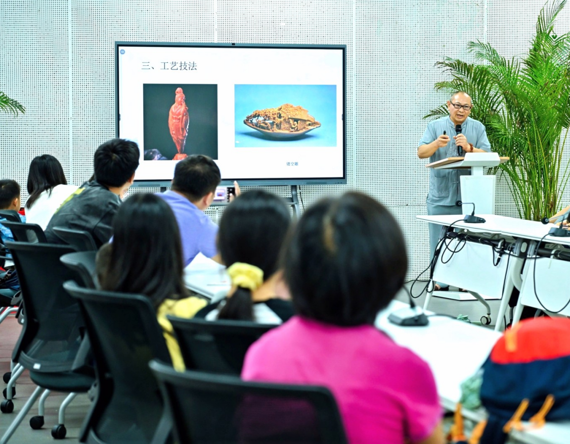 欖雕,作為嶺南文化的重要組成部分,歷史悠久,源遠(yuǎn)流長。它以烏欖核為原料,經(jīng)過巧妙的構(gòu)思和精湛的雕刻技藝,創(chuàng)作出形態(tài)各異、栩栩如生的藝術(shù)品。本次活動周漢軍師生團(tuán)隊(duì)現(xiàn)場講學(xué),傳承欖雕技藝和中華優(yōu)秀傳統(tǒng)文化。