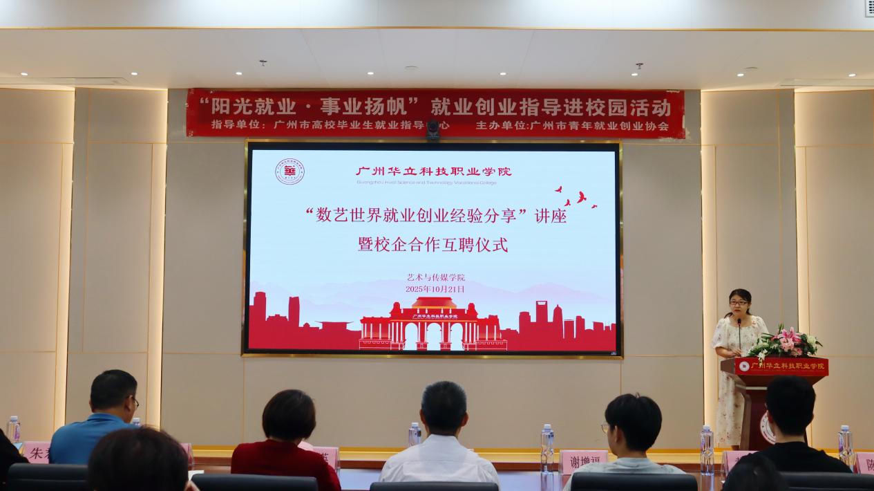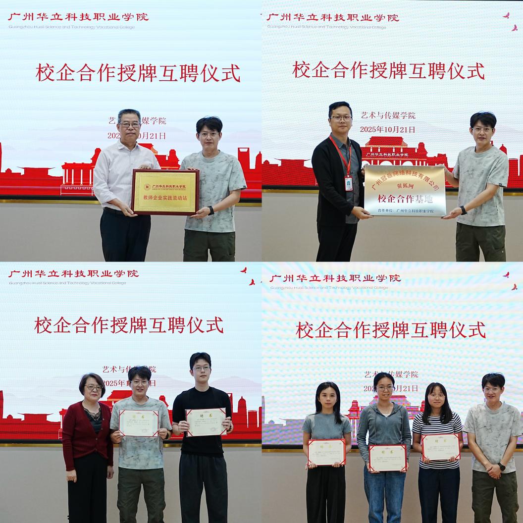 為深化產(chǎn)教融合,拓寬學(xué)生就業(yè)創(chuàng)業(yè)視野,2025年10月21日下午,廣州華立科技職業(yè)學(xué)院藝術(shù)與傳媒學(xué)院與廣州冠岳網(wǎng)絡(luò)科技有限公司在學(xué)校圖書館104隆重舉行了“數(shù)藝世界”校企合作簽約授牌互聘儀式暨就業(yè)創(chuàng)業(yè)經(jīng)驗分享會。本次活動得到了校企雙方的高度重視。學(xué)校副校長陳顯強、教務(wù)處處長孫麗英、實踐教學(xué)科科長韋建林,藝術(shù)與傳媒學(xué)院院長朱君、黨總支書記陳改梅等領(lǐng)導(dǎo)老師出席活動。廣州冠岳網(wǎng)絡(luò)科技有限公司謝增福經(jīng)理、黃龍城項目總監(jiān)作為企業(yè)方代表參會。