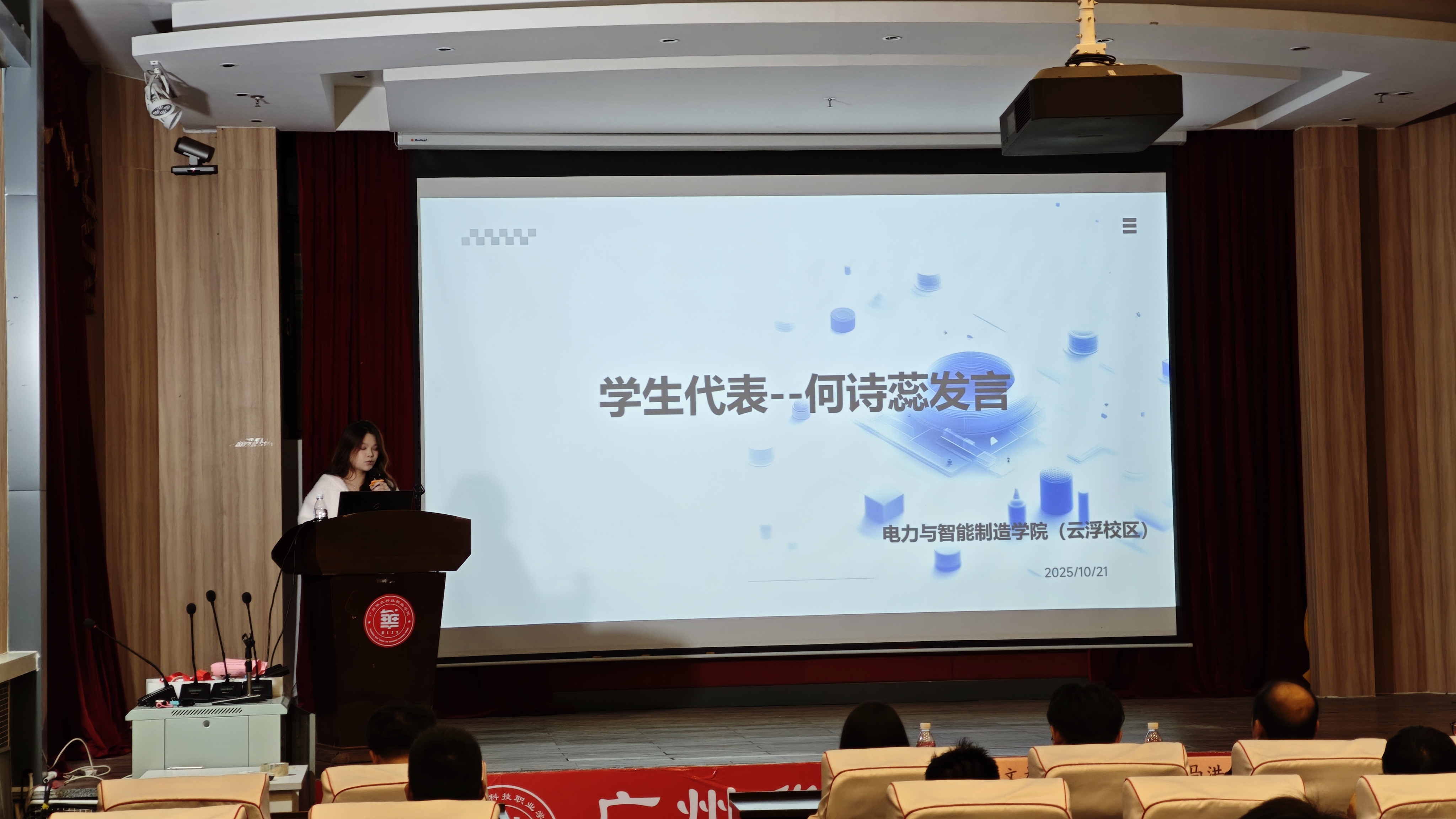 在經(jīng)驗(yàn)分享環(huán)節(jié),獲獎學(xué)生代表何詩蕊登臺分享了參與多項(xiàng)技能競賽的心路歷程與收獲。她結(jié)合自身從知識積累、團(tuán)隊(duì)協(xié)作到攻克難題、實(shí)現(xiàn)成長的經(jīng)歷,生動展現(xiàn)了我?!案傎愑恕钡某尚?,為同學(xué)們樹立了學(xué)習(xí)榜樣,激發(fā)了大家的參與熱情。