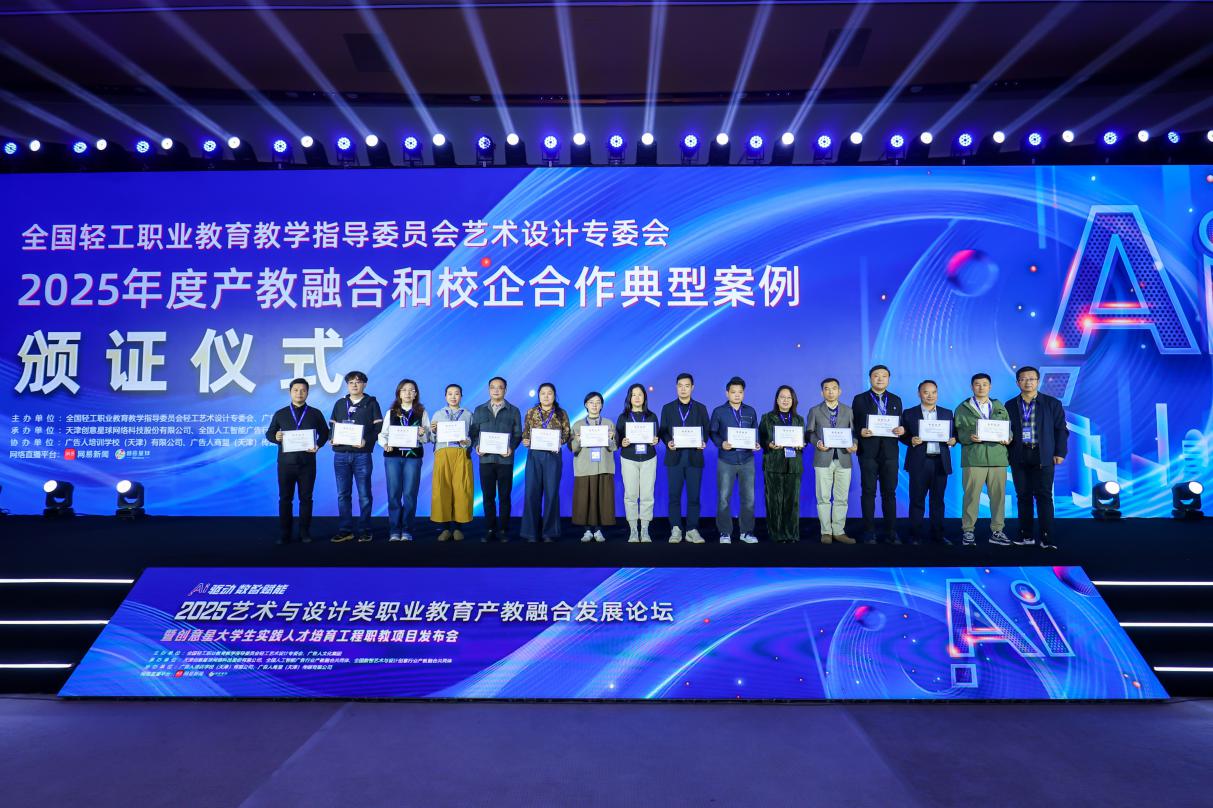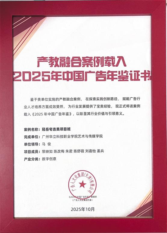 此次研討會(huì)是華立職院在藝術(shù)設(shè)計(jì)教育創(chuàng)新和產(chǎn)教融合方面邁出的重要一步。經(jīng)全國輕工藝術(shù)設(shè)計(jì)專業(yè)委員會(huì)和共同體專家評(píng)審:由馬俊 、肖釗俊、沈泓睿、王渡讀團(tuán)隊(duì)制作的紀(jì)錄片榮獲中國大學(xué)生廣告藝術(shù)學(xué)院獎(jiǎng) 2025年“筑夢(mèng)產(chǎn)教·校長印記”賽項(xiàng)“金獎(jiǎng)”;華立職院產(chǎn)教融合案例“植根基層、融通藝工、淬煉實(shí)戰(zhàn):高職藝術(shù)設(shè)計(jì)產(chǎn)教融合育人新模式的探索與實(shí)踐”榮獲“產(chǎn)教融合典型案例”;華立職院藝術(shù)與傳媒學(xué)院黨總支書記陳改梅、就業(yè)主任黎映如獲聘“全國輕工藝術(shù)設(shè)計(jì)專委會(huì)智庫專家”;華立職院“冠岳宅吉美項(xiàng)目班”產(chǎn)教融合案例,正式載入《2025年中國廣告年鑒》,以彰顯其行業(yè)價(jià)值與引領(lǐng)意義;學(xué)校獲評(píng)創(chuàng)意星大學(xué)生實(shí)踐人才培育工程-廣州華立科技職業(yè)學(xué)院網(wǎng)易傳媒新媒體人才孵化計(jì)劃實(shí)訓(xùn)單位。