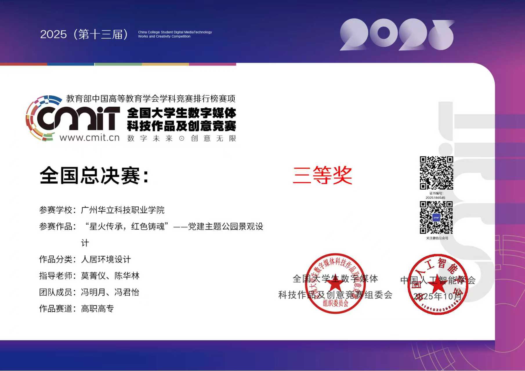 其中,由程若愚、莫菁儀、陳華林老師指導(dǎo),陳佳怡、馮明月等同學(xué)完成的作品《嶼光別院-鄉(xiāng)村民宿設(shè)計(jì)》、《星火傳承,紅色鑄魂”--黨建主題公園景觀設(shè)計(jì)》在全國(guó)大學(xué)生數(shù)字媒體科技作品及創(chuàng)意競(jìng)賽全國(guó)總決賽中榮獲三等獎(jiǎng)2項(xiàng),廣東賽區(qū)中獲二等獎(jiǎng)2項(xiàng);由田婭娟、莫菁儀、陳華林老師指導(dǎo),何穎詩(shī)、馮君怡等同學(xué)完成作品《池上幽居靜寄山莊池上居復(fù)原與改造設(shè)計(jì)》、《“廬州軌跡”--道路節(jié)點(diǎn)綠化景觀工程恢復(fù)設(shè)計(jì)》榮獲廣東賽區(qū)三等獎(jiǎng)2項(xiàng)。