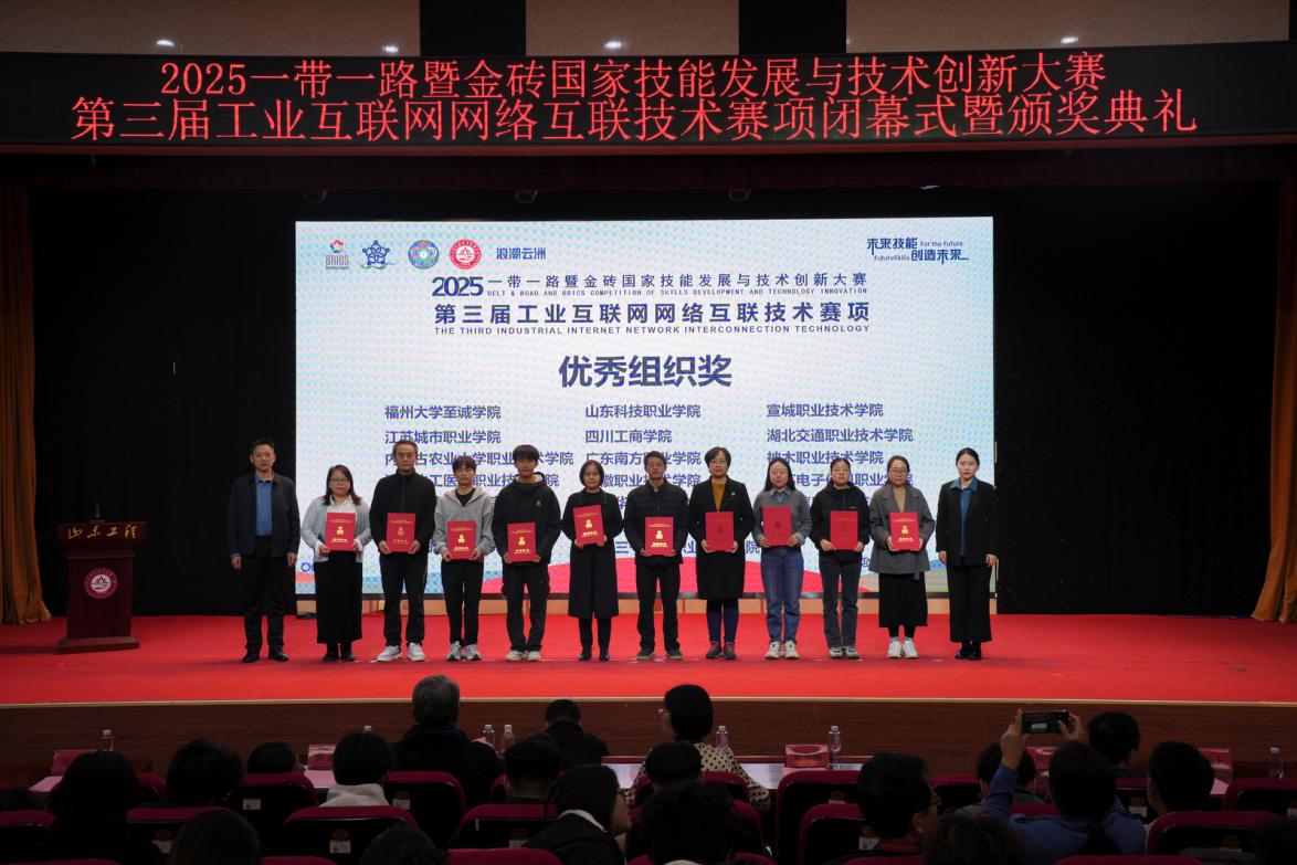 2025年11月7日-9日,2025年“一帶一路”暨金磚國家技能發(fā)展與技術(shù)創(chuàng)新大賽第三屆工業(yè)互聯(lián)網(wǎng)網(wǎng)絡(luò)互聯(lián)技術(shù)賽項全國總決賽在山東工程職業(yè)技術(shù)大學(xué)隆重舉行,吸引了來自全國81所院校的132支參賽隊伍同場競技。我校計算機(jī)信息工程學(xué)院閔小翠、王建華老師指導(dǎo)選派的兩支代表隊(1隊:馮俊杰,劉俊浩、2隊:彭依琳,魏淙正),在全國總決賽賽場上,歷經(jīng)四小時的激烈比拼,最終憑借扎實的專業(yè)知識、科學(xué)的團(tuán)隊協(xié)作,最終脫穎而出,榮獲全國總決賽二等獎1項、三等獎1項,為學(xué)校贏得榮譽(yù)。我校榮獲“優(yōu)秀組織獎”、兩位指導(dǎo)教師榮獲“優(yōu)秀指導(dǎo)教師”稱號。