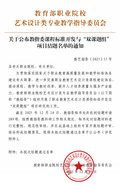 近日,教育部職業(yè)院校藝術(shù)設(shè)計(jì)類專業(yè)教學(xué)指導(dǎo)委員會(huì)正式公布課程標(biāo)準(zhǔn)開發(fā)與“雙課題組”項(xiàng)目結(jié)題名單。廣州華立科技職業(yè)學(xué)院藝術(shù)與傳媒學(xué)院申報(bào)的五項(xiàng)課題全部通過結(jié)題評(píng)審,展現(xiàn)了學(xué)校在職業(yè)教育藝術(shù)設(shè)計(jì)類專業(yè)建設(shè)中的扎實(shí)成果與創(chuàng)新活力。