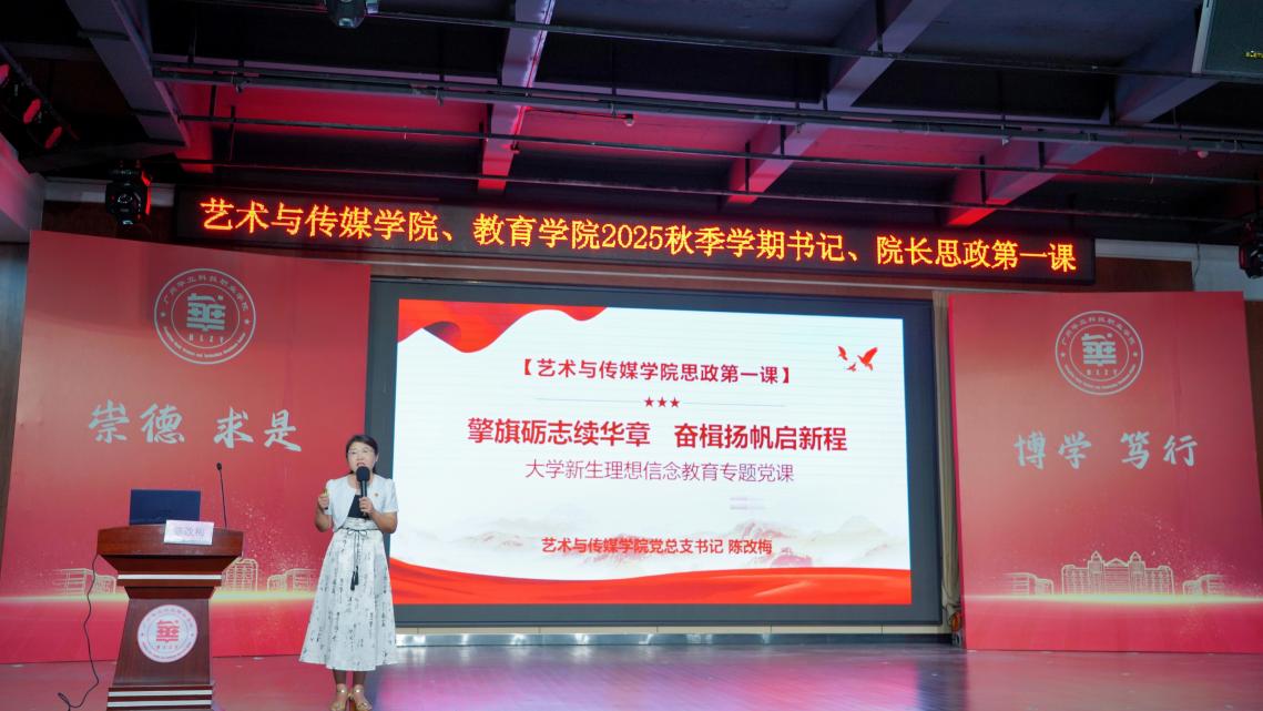 為引導(dǎo)和幫助青年學(xué)子學(xué)會用習(xí)近平新時(shí)代中國特色社會主義思想的先進(jìn)理論武裝頭腦,將個人成長與民族復(fù)興緊密相連,扣好人生“第一??圩印保?月11日晚,藝術(shù)與傳媒學(xué)院黨總支書記陳改梅老師以 “擎旗礪志續(xù)華章 奮楫揚(yáng)帆啟新程”為主題,在圖書館八樓報(bào)告廳,為藝術(shù)與傳媒學(xué)院、教育學(xué)院新生帶來了情感觸動強(qiáng)烈、思想啟迪深刻的“思政第一課”。學(xué)院院長朱君、教師黨員和2025級新生參加聽課。