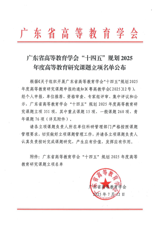 2025年7月12日,《廣東省高等教育學(xué)會“十四五”規(guī)劃2025年度高等教育研究課題擬立項名單公示》發(fā)布,我校獲得6項立項,其中,重點(diǎn)課題1項,一般課題5項,青年課題1項。