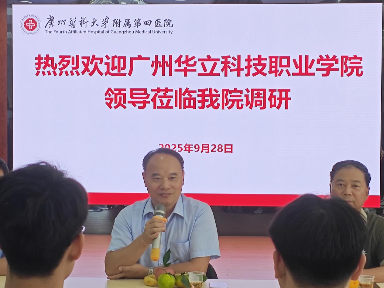 在國慶、中秋雙節(jié)來臨之際,2025年9月28日下午,我校廖俊杰校長、教務處孫麗英處長、實踐教學科韋建林科長、健康學院雷毅雄院長、李國良副院長、行政主任梁瑞云、實習指導老師鄧香華、楊鵬一行赴廣州醫(yī)科大學附屬第四醫(yī)院訪企拓崗,給健康學院2023級在該醫(yī)院進行臨床實習的華立學子們送去節(jié)日的關(guān)懷。廣州醫(yī)科大學附屬第四醫(yī)院郭建軍副院長,科教科劉志毅副科長、陳彩青科護長,張琴口腔科主任等院領(lǐng)導熱情參與了中秋慰問活動。