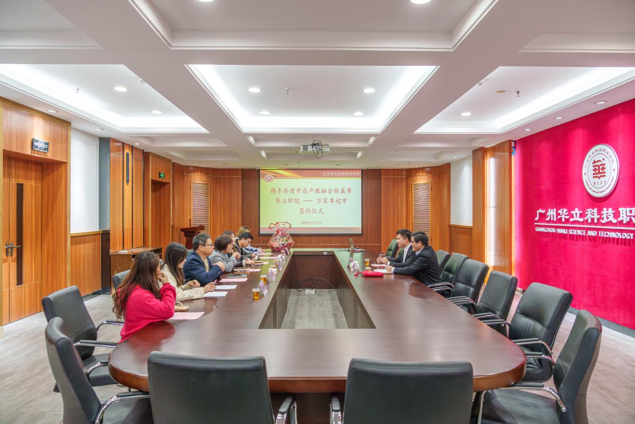 2025年11月20日,廣州華立科技職業(yè)學(xué)院與云浮市萬家粵超市有限公司在云浮校區(qū)圖書館一樓會(huì)議室舉行以“攜手共進(jìn),開啟產(chǎn)教融合新篇章”為主題的校企合作簽約儀式。萬家粵超市總經(jīng)理林坤爍、企劃部經(jīng)理林暑佳,廣州華立科技職業(yè)學(xué)院黨委副書記、副校長王洪艷,經(jīng)管學(xué)院副院長劉軍根、學(xué)校辦公室副主任林子云、黨委宣傳部副部長劉廣等校企代表出席儀式。
