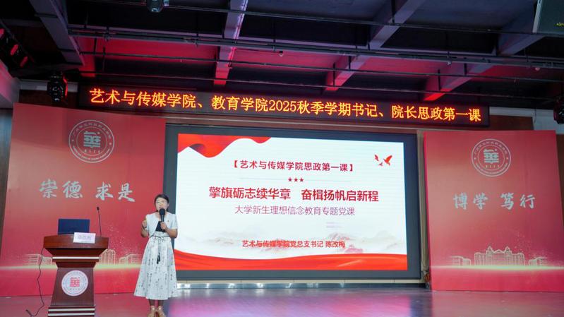 為引導(dǎo)和幫助青年學(xué)子學(xué)會(huì)用習(xí)近平新時(shí)代中國特色社會(huì)主義思想的先進(jìn)理論武裝頭腦,將個(gè)人成長與民族復(fù)興緊密相連,扣好人生“第一粒扣子”,9月11日晚,藝術(shù)與傳媒學(xué)院黨總支書記陳改梅老師以 “擎旗礪志續(xù)華章 奮楫揚(yáng)帆啟新程”為主題,在圖書館八樓報(bào)告廳,為藝術(shù)與傳媒學(xué)院、教育學(xué)院新生帶來了情感觸動(dòng)強(qiáng)烈、思想啟迪深刻的“思政第一課”。學(xué)院院長朱君、教師黨員和2025級(jí)新生參加聽課。