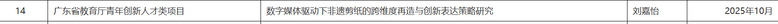 2025年8月,《十五運會和殘?zhí)貖W會粵港澳協(xié)同發(fā)展理論與實踐研究項目》立項名單公布,學(xué)院朱君老師的《十五運會志愿服務(wù)助力大學(xué)生核心素養(yǎng)培育研究》、冼曉茵老師的《粵港澳聯(lián)合辦賽對國家統(tǒng)戰(zhàn)大局的影響》兩項課題成功獲批。2025年10月,省教育廳青年創(chuàng)新人才類項目立項中,學(xué)院劉嘉怡老師的《數(shù)字媒體驅(qū)動下非遺剪紙跨維度再造與創(chuàng)新表達(dá)研究》成功獲批。