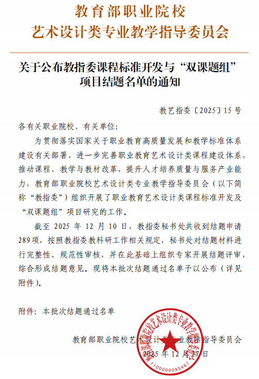 近日,教育部職業(yè)院校藝術(shù)設(shè)計(jì)類專業(yè)教學(xué)指導(dǎo)委員會(huì)正式公布課程標(biāo)準(zhǔn)開發(fā)與“雙課題組”項(xiàng)目結(jié)題名單。廣州華立科技職業(yè)學(xué)院藝術(shù)與傳媒學(xué)院申報(bào)的五項(xiàng)課題全部通過結(jié)題評(píng)審,展現(xiàn)了學(xué)校在職業(yè)教育藝術(shù)設(shè)計(jì)類專業(yè)建設(shè)中的扎實(shí)成果與創(chuàng)新活力。