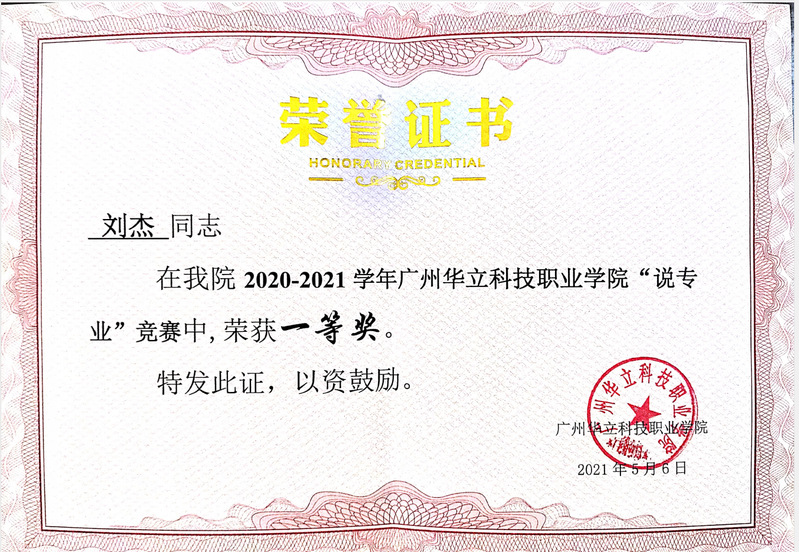 2020-2021學(xué)年廣州華立科技職業(yè)學(xué)院“說專業(yè)”競(jìng)賽在2021年4月28日正式落下帷幕,8個(gè)二級(jí)學(xué)院選送的參賽老師,參加了這次別開生面的比賽。本次比賽教務(wù)處組織牽頭,由馬龍海執(zhí)行校長(zhǎng)擔(dān)任評(píng)審組組長(zhǎng),學(xué)校領(lǐng)導(dǎo)專家、二級(jí)學(xué)院院長(zhǎng)以及職能部門負(fù)責(zé)人等組成評(píng)審團(tuán),對(duì)賽事進(jìn)行了專業(yè)而嚴(yán)謹(jǐn)?shù)脑u(píng)審工作。最終經(jīng)過公正嚴(yán)謹(jǐn)?shù)某煽?jī)統(tǒng)計(jì),我院劉杰老師獲得“說專業(yè)”競(jìng)賽一等獎(jiǎng)。