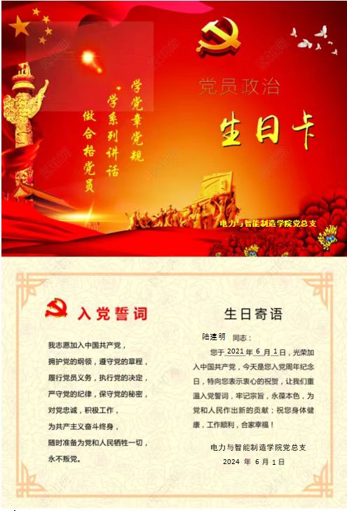 作為電力與智能制造學(xué)院的一名教師黨員陸建明,6月1日早上,收到了學(xué)院黨組織發(fā)的“政治生日”賀卡,心情特別興奮,6月1日是我加入中國共產(chǎn)黨的日子。