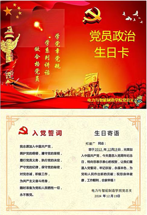 作為電力與智能制造學(xué)院的一名黨員教師鄭理廣,在收到學(xué)院黨組織發(fā)來的“政治生日”賀卡,我的心情特別興奮,也感謝組織的關(guān)懷。12月19日是我的政治生日,這不僅是一個(gè)簡單的紀(jì)念日,而是我內(nèi)心深處對(duì)黨深沉情感的流露,是我對(duì)黨的無限忠誠和堅(jiān)定信仰的深情表達(dá)。