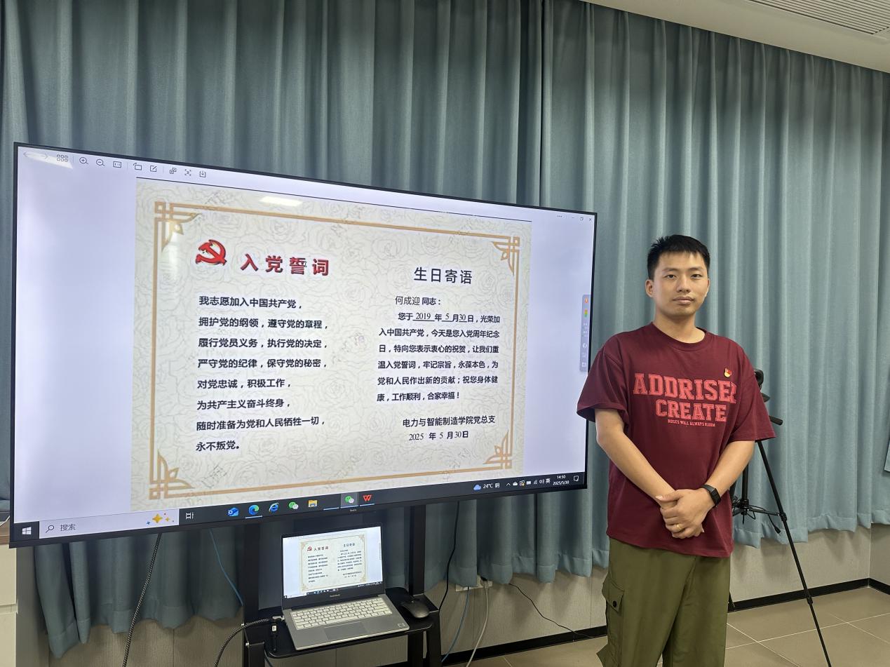 作為電力與智能制造學院云浮校區(qū)的一名輔導員何成迎,5月30日上午,收到了學院黨組織發(fā)的“政治生日”賀卡,心情特別興奮。五載時光如水流逝,卻清晰記得2019年那個五月的日子,當我在黨旗下莊嚴宣誓,那一刻,黨的崇高理想便如種子般在我心中扎下了根。如今,在學院輔導員崗位上迎來我的政治生日,重溫誓詞,再撫初心,感到這不僅是個人信仰的刻度尺,更是一份沉甸甸的責任記。