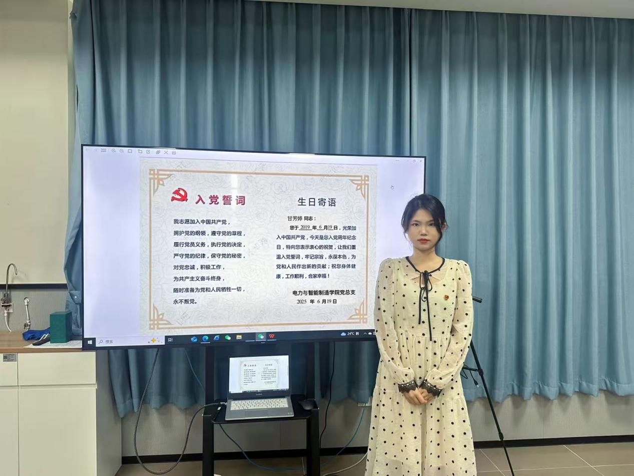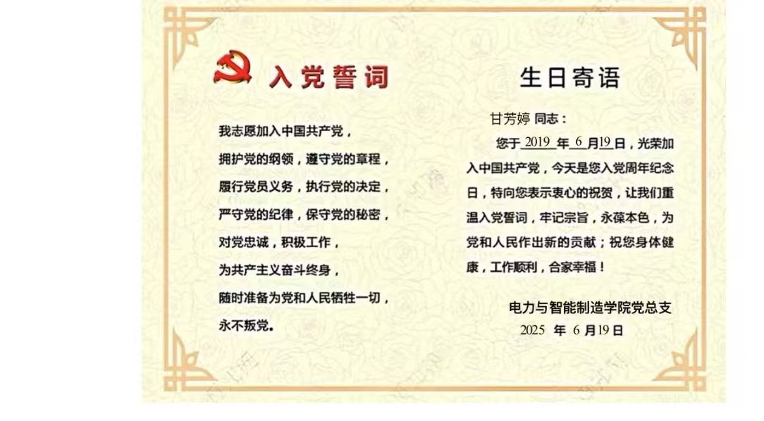 2025年6月19日,作為電力與智能制造學(xué)院云浮校區(qū)的教師黨員,收到了黨組織送來的“政治生日”賀卡。這一天,于我而言,意義非凡。它不僅是我政治生日的莊嚴(yán)誕辰,更像是一座永不熄滅的燈塔,照亮信仰的征程,讓象征著理想與信念的火種,在歲月的長河中生生不息,始終散發(fā)著溫暖而堅(jiān)定的光芒。在教育教學(xué)的道路上和探索中,在服務(wù)師生的點(diǎn)滴日常里,推動(dòng)著我無畏向前,永不停歇。