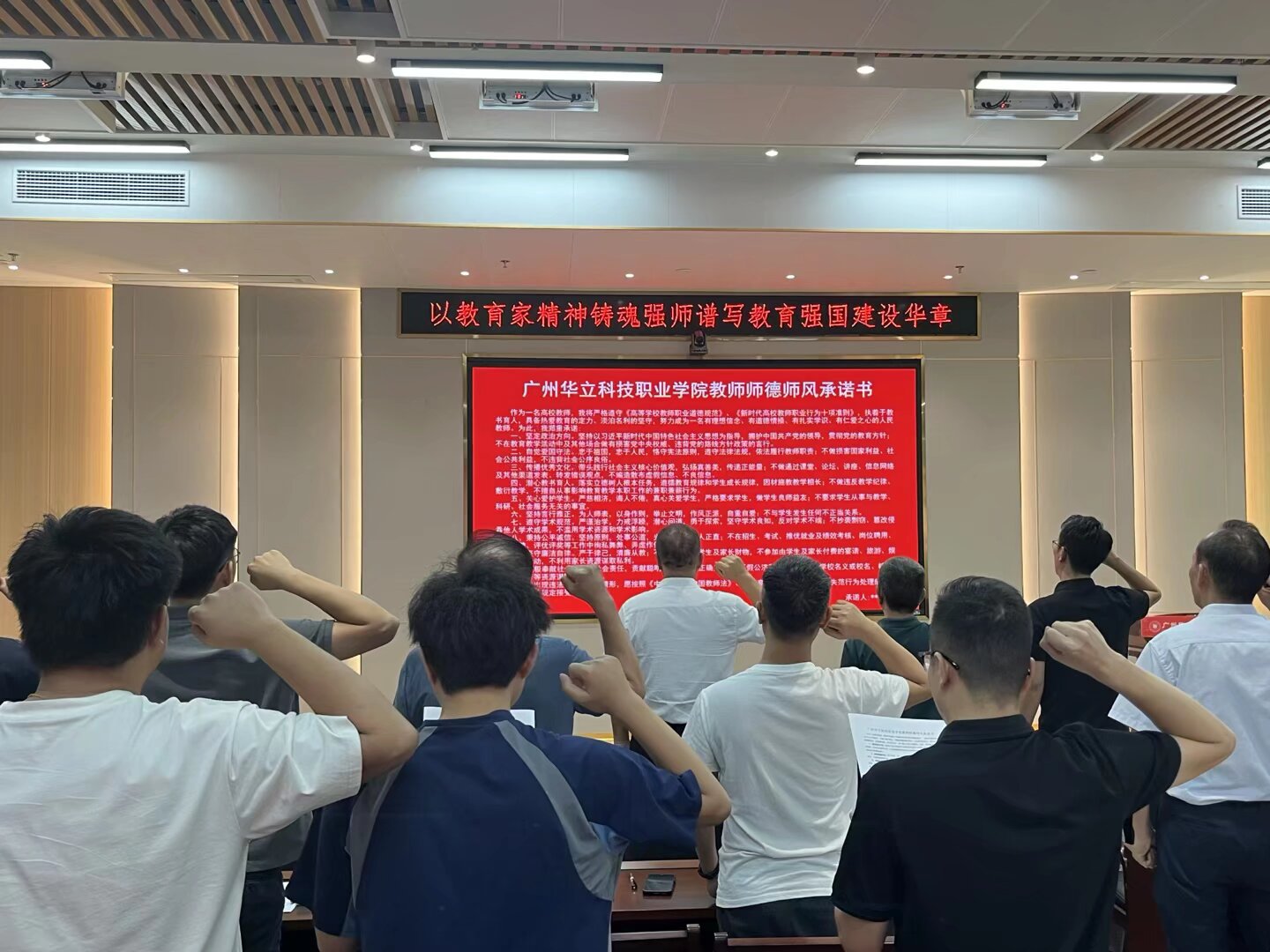 首先,全體教師共同承諾《廣州華立科技職業(yè)學(xué)院教師師德師風(fēng)承諾書》,老師們以莊重的聲音立誓:嚴(yán)格遵守《高等學(xué)校教師職業(yè)道德規(guī)范》、《新時(shí)代高校教師職業(yè)行為十項(xiàng)準(zhǔn)則》,努力成為有理想信念、有道德情操、有扎實(shí)學(xué)識(shí)、有仁愛之心的人民教師。