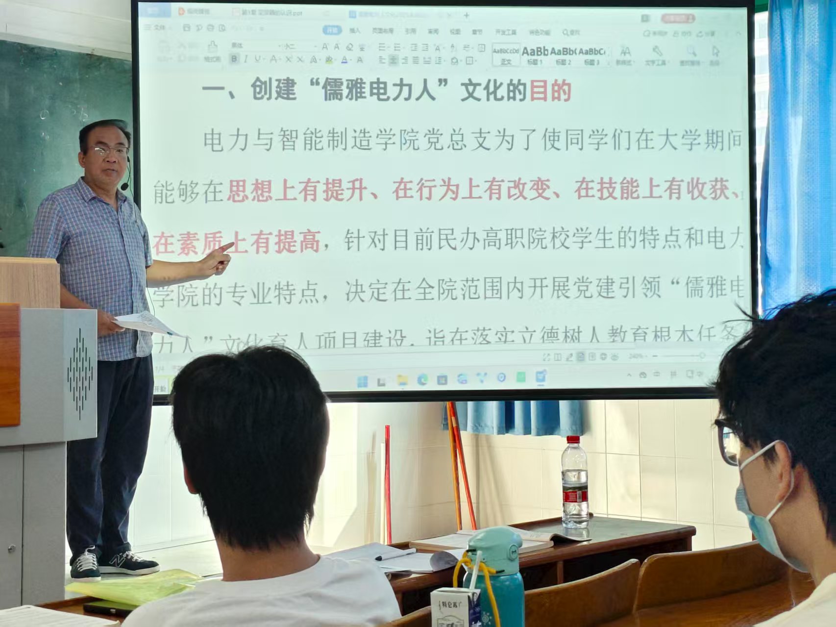 在“儒雅電力人”文化講解環(huán)節(jié),教師們結(jié)合學(xué)院發(fā)展歷程與各個(gè)專業(yè)行業(yè)特色,從“儒雅”的精神內(nèi)涵、行為準(zhǔn)則展開闡述。引導(dǎo)學(xué)生理解“儒雅”不僅是外在言行的得體,更是內(nèi)在專業(yè)素養(yǎng)、責(zé)任擔(dān)當(dāng)?shù)捏w現(xiàn)。在實(shí)驗(yàn)室中嚴(yán)謹(jǐn)操作、在學(xué)習(xí)中謙遜求知、在未來工作中恪守行業(yè)規(guī)范,皆是“儒雅電力人”的生動(dòng)實(shí)踐。針對(duì)大一新生,教師重點(diǎn)講解文化認(rèn)知與角色轉(zhuǎn)變,幫助其建立學(xué)院歸屬感;對(duì)于大二,則結(jié)合專業(yè)學(xué)習(xí)進(jìn)度,強(qiáng)調(diào)將文化理念融入專業(yè)實(shí)踐。各位老師還為學(xué)生們講解了“三寶學(xué)風(fēng)”建設(shè)內(nèi)涵。“書、筆、本|”三件寶貝,作為學(xué)風(fēng)建設(shè)的核心載體,需要學(xué)生每節(jié)課都攜帶,方便記錄教師補(bǔ)充內(nèi)容和做作業(yè),這些都屬于學(xué)習(xí)態(tài)度的考核內(nèi)容。