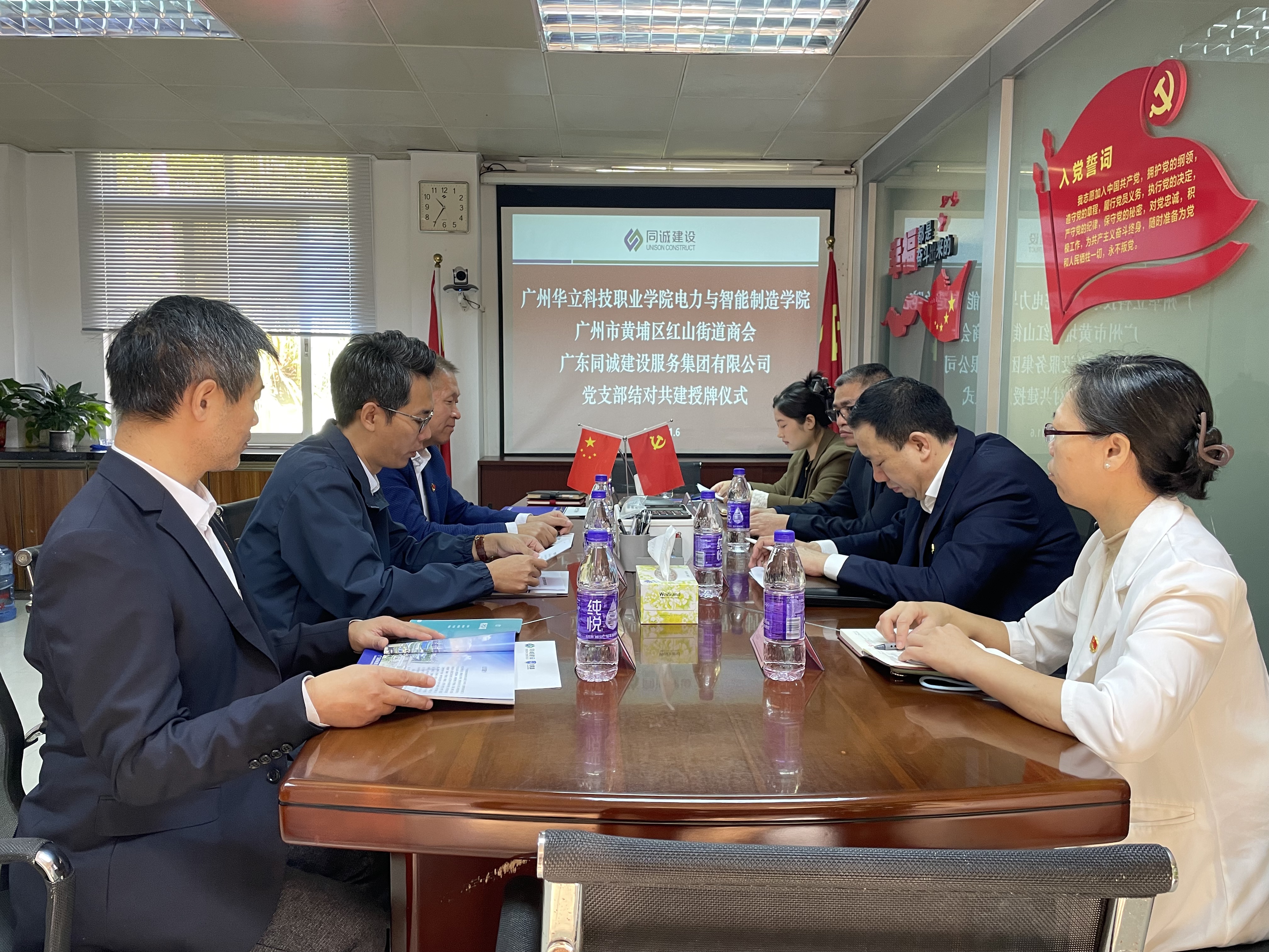 為深入推進學(xué)院“雙帶頭人”教師黨支部書記“廣東行”專項行動,更好發(fā)揮“雙帶頭人”教師黨支部書記的示范引領(lǐng)作用,促進校企黨建工作交流與合作。11月6日,電力與智能制造學(xué)院教師黨支部與廣州市黃埔區(qū)紅山街道商會、廣東同誠建設(shè)服務(wù)集團有限公司黨支部,在廣東同誠建設(shè)服務(wù)集團有限公司會議室舉行了結(jié)對共建儀式。