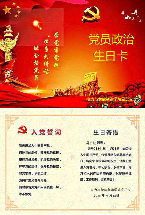 作為電力與智能制造學(xué)院云浮校區(qū)副院長(zhǎng)馬洪德,4月18日早上收到了學(xué)院黨組織的“政治生日”賀卡,我心情特別興奮,1994年4月18日是我加入中國(guó)共產(chǎn)黨的日子。