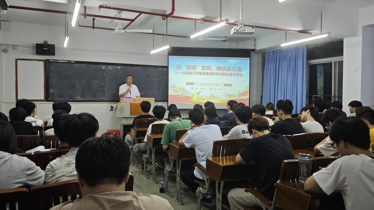 為深入學(xué)習(xí)貫徹2026年全國(guó)兩會(huì)精神,幫助我院學(xué)子找準(zhǔn)時(shí)代定位、明確技能成才方向,3月25日,電力與智能制造學(xué)院在西一403課室開(kāi)展春季學(xué)期“思政第一課”專題學(xué)習(xí)。學(xué)院黨總支書記褚玉峰以《乘“新質(zhì)”東風(fēng),鑄技能之魂——從政府工作報(bào)告看高職學(xué)子的機(jī)遇與擔(dān)當(dāng)》為主題,為同學(xué)們講授思政第一課。