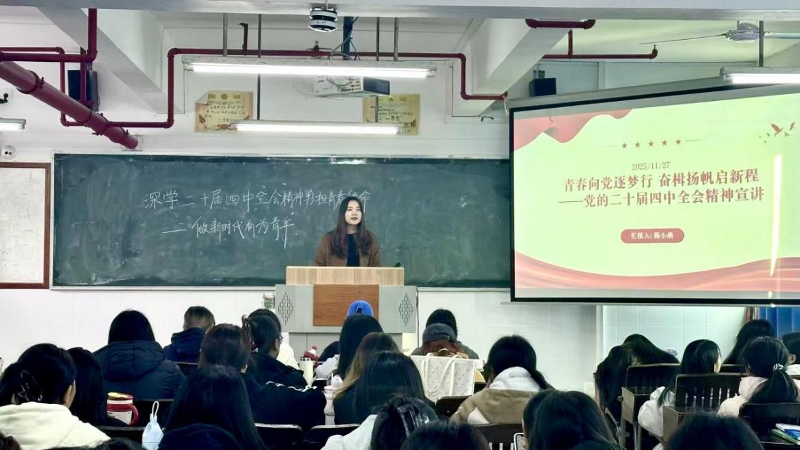 為深入學(xué)習(xí)宣傳黨的全會(huì)精神,引導(dǎo)青年學(xué)子堅(jiān)定理想信念、勇?lián)鷷r(shí)代使命,2025年11月28日上午,廣州華立科技職業(yè)學(xué)院健康學(xué)院在西三603教室順利舉行“青春向黨逐夢行 奮楫揚(yáng)帆啟新程——黨的二十屆四中全會(huì)精神專題宣講” 活動(dòng)。本次宣講由健康學(xué)院輔導(dǎo)員陳小燕老師主講。