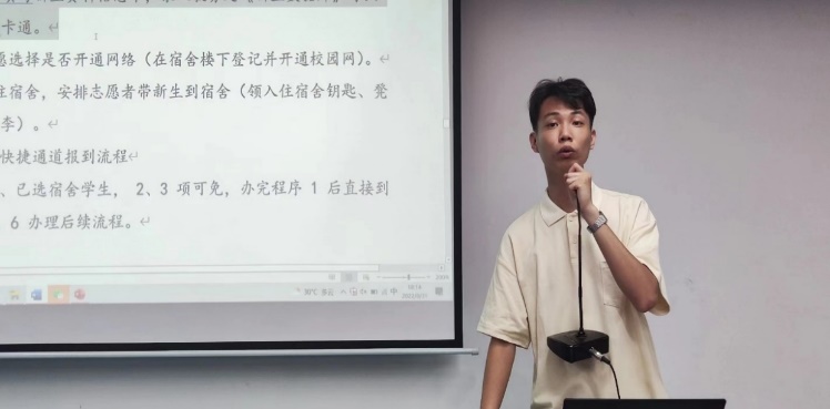會(huì)議上計(jì)算機(jī)學(xué)院團(tuán)總支書記溫??@蠋煘橛轮驹刚邆兗?xì)致的講解了迎新工作流程