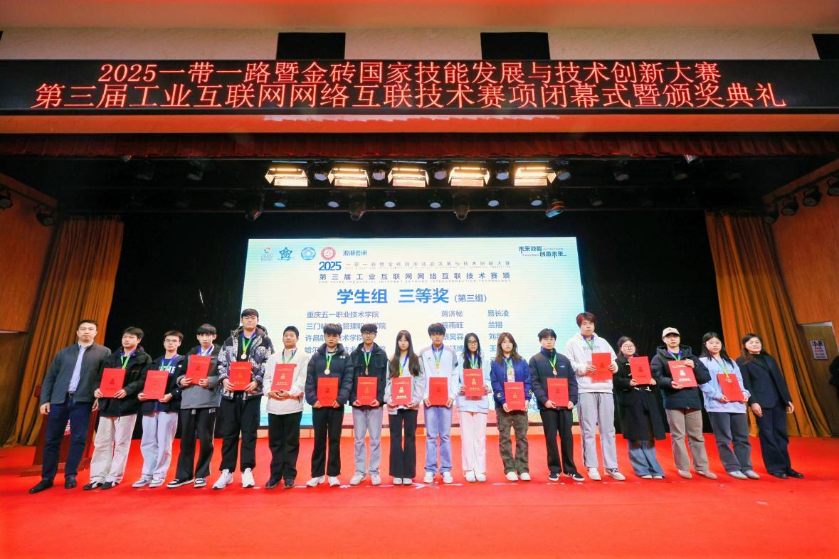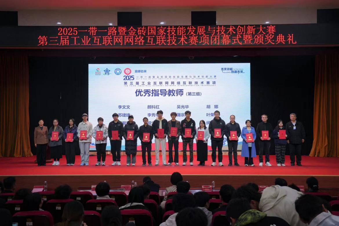 2025年11月7日-9日,2025年“一帶一路”暨金磚國家技能發(fā)展與技術(shù)創(chuàng)新大賽第三屆工業(yè)互聯(lián)網(wǎng)網(wǎng)絡(luò)互聯(lián)技術(shù)賽項(xiàng)全國總決賽在山東工程職業(yè)技術(shù)大學(xué)隆重舉行,吸引了來自全國81所院校的132支參賽隊(duì)伍同場競技。我校計(jì)算機(jī)信息工程學(xué)院閔小翠、王建華老師指導(dǎo)選派的兩支代表隊(duì)(1隊(duì):馮俊杰,劉俊浩、2隊(duì):彭依琳,魏淙正),在全國總決賽賽場上,歷經(jīng)四小時(shí)的激烈比拼,最終憑借扎實(shí)的專業(yè)知識、科學(xué)的團(tuán)隊(duì)協(xié)作,最終脫穎而出,榮獲全國總決賽二等獎(jiǎng)1項(xiàng)、三等獎(jiǎng)1項(xiàng),為學(xué)校贏得榮譽(yù)。我校榮獲“優(yōu)秀組織獎(jiǎng)”、兩位指導(dǎo)教師榮獲“優(yōu)秀指導(dǎo)教師”稱號。