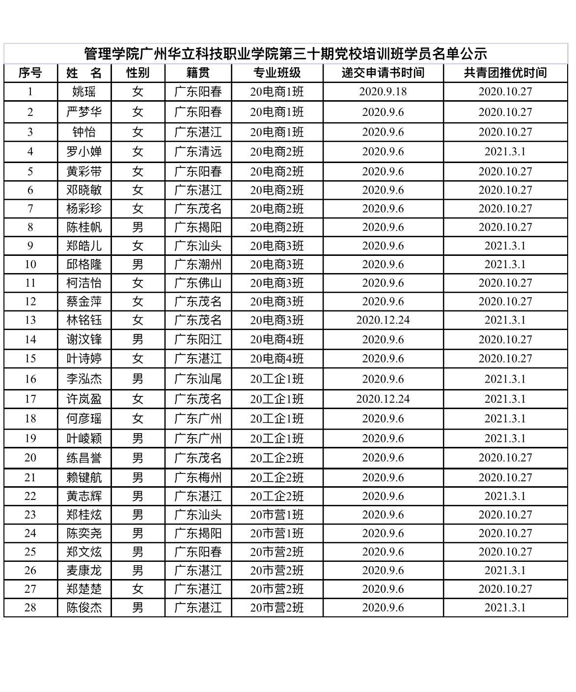 根據(jù)學(xué)校黨委相關(guān)文件規(guī)定,經(jīng)學(xué)生本人申請(qǐng)、團(tuán)支部推薦、輔導(dǎo)員推薦、黨支部考察,黨總支研究決定,擬將我院姚瑤等28名同學(xué)列為第30期黨校培訓(xùn)班學(xué)員,現(xiàn)將本次培訓(xùn)班學(xué)員的名單公示如下(具體名單見(jiàn)附件)。